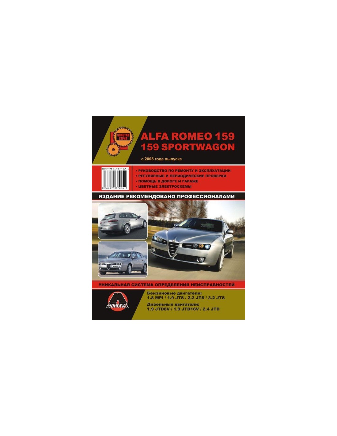 Книга по ремонту Alfa Romeo 159 / 159 Sportwagon (с 2005) ,содержит руководство по эксплуатации,подробные сведения по техническому обслуживанию автомобиля,диагностике ремонту и регулировке элементов систем двигателя,в том числе электронного управления двигателем,систему смазки и охлаждения,запуска и зарядки,элементов механических и автоматических коробок передач,раздаточной коробки,тормозной системы,включая антиблокировочную систему тормозов,рулевого управления,подвески,кузовных элементов, систем кондиционирования и вентиляции.