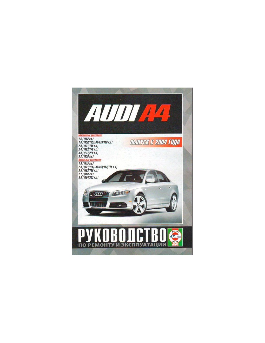 Устройство автомобиля,возможные неисправности и методы их устранения, сопрягаемые размеры основных деталей и пределы их допустимого износа,рекомендуемое смазочные материалы,рабочие жидкости и т.п-все это можно найти на страницах издания "Гуси-лебеди" Книга автомобильная на Audi A4 с 2004 г.