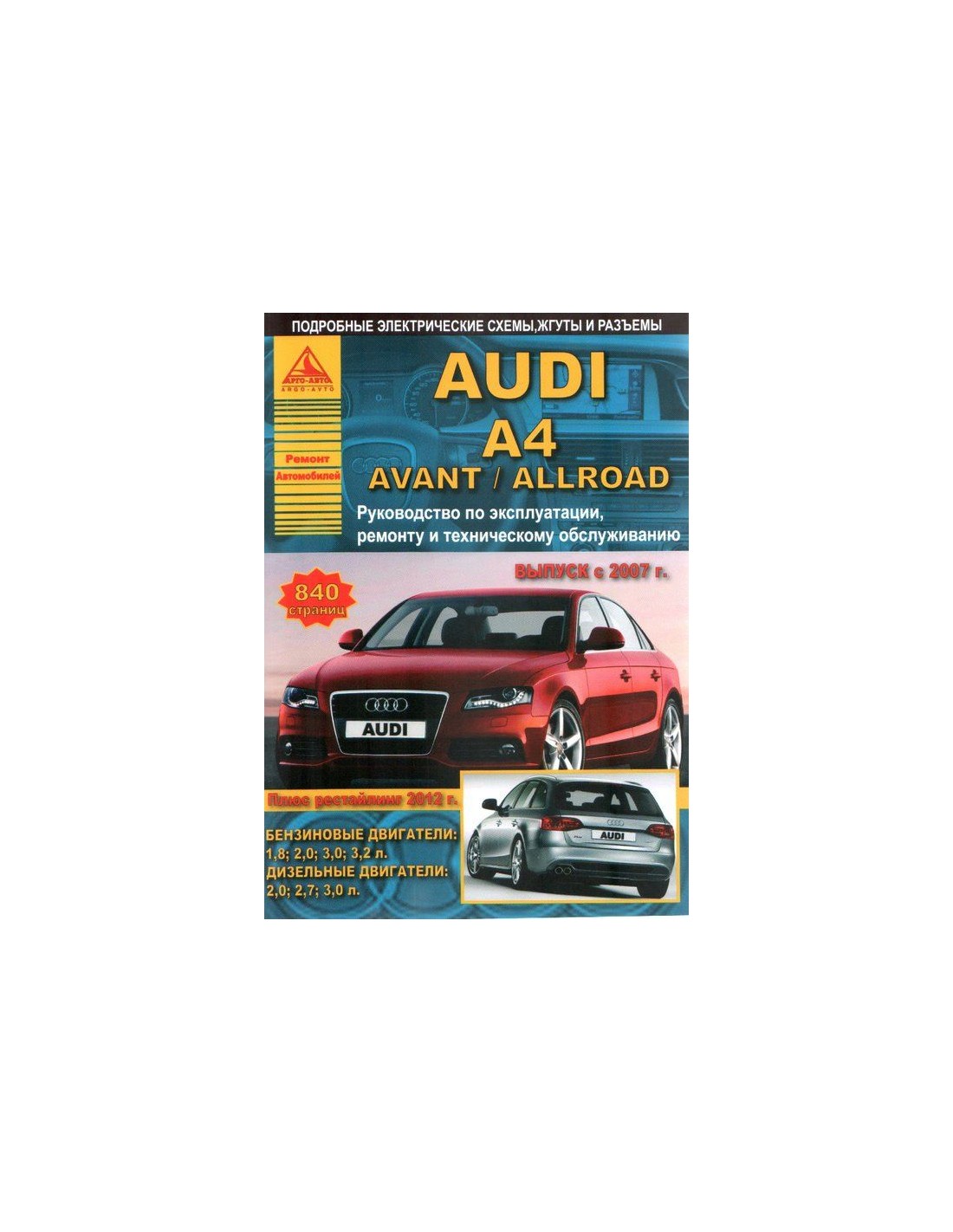 Книга по ремонту Audi A4 / Avant / Allroad 2007-15 г.рестайлинг 2012 г.,содержит руководство по эксплуатации,подробные сведения по техническому обслуживанию автомобиля,систему смазки и охлаждения,запуска и зарядки,элементов механических и автоматических коробок передач,тормозной системы,включая антиблокировочную систему тормозов,рулевого управления,подвески,кузовных элементов, систем кондиционирования и вентиляции.