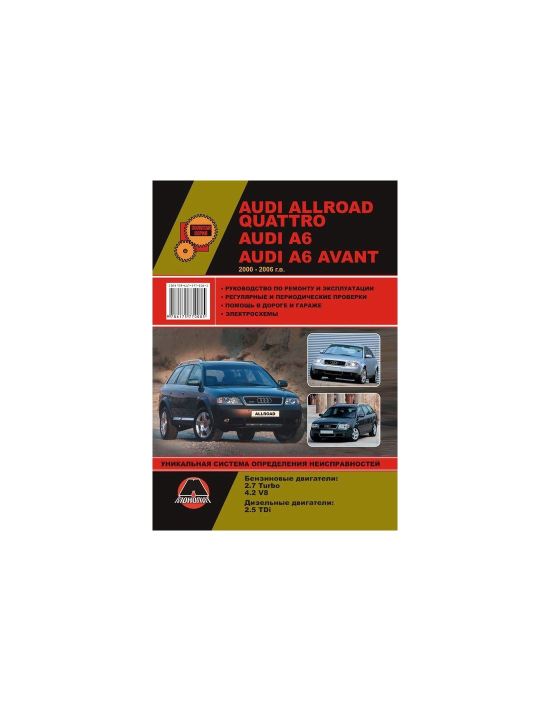 Книга по ремонту Audi A6 / Allroad / Quattro / Avant (2000-06) ,содержит руководство по эксплуатации,подробные сведения по техническому обслуживанию автомобиля,диагностике ремонту и регулировке элементов систем двигателя,в том числе электронного управления двигателем,систему смазки и охлаждения,запуска и зарядки,элементов механических и автоматических коробок передач,раздаточной коробки,тормозной системы,включая антиблокировочную систему тормозов,рулевого управления,подвески,кузовных элементов, систем кондиционирования и вентиляции.