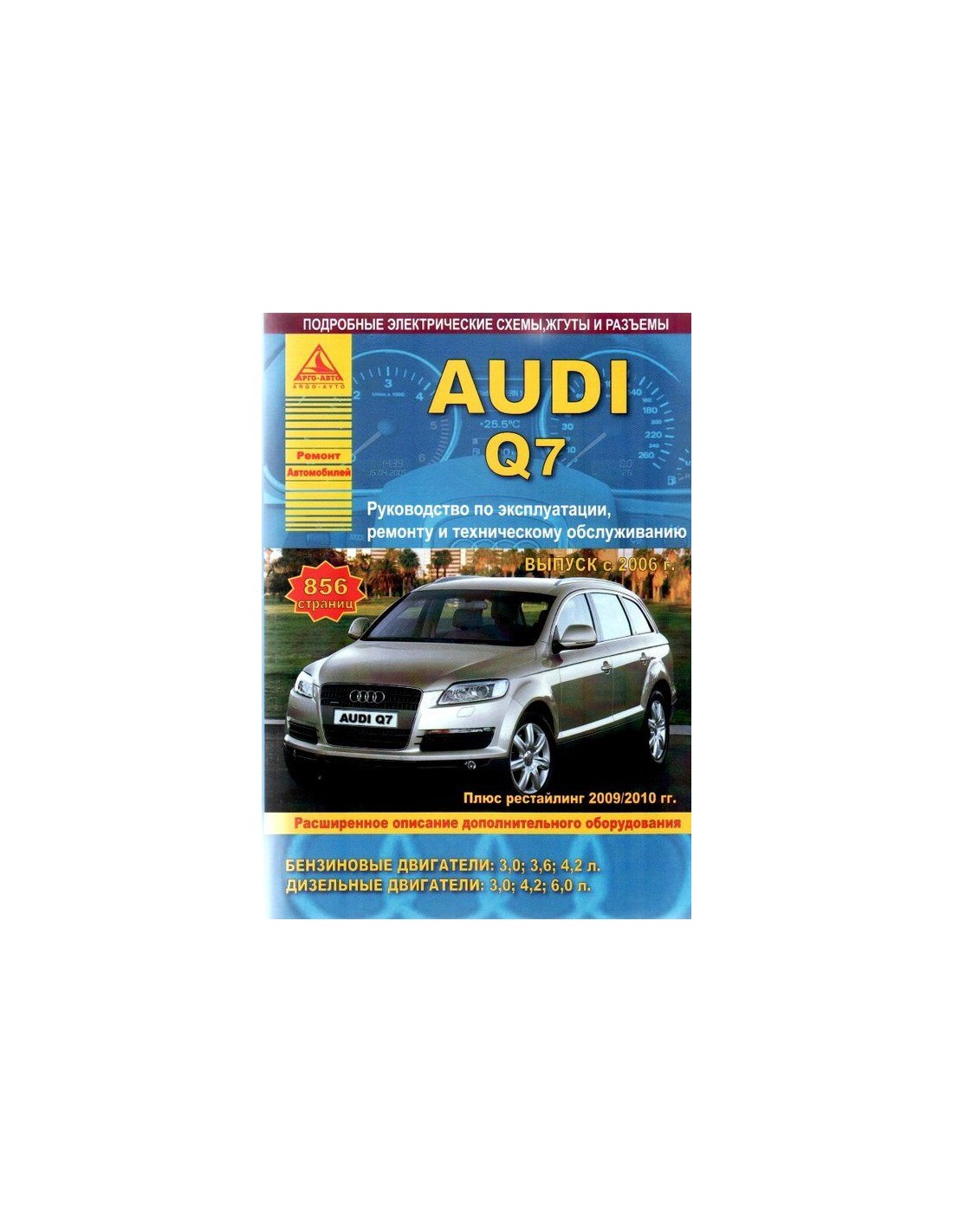 Книга по ремонту Audi Q7 c 2006-15 г.,рестайлинг 2009/2010 г.,содержит руководство по эксплуатации,подробные сведения по техническому обслуживанию автомобиля,систему смазки и охлаждения,запуска и зарядки,элементов механических и автоматических коробок передач,тормозной системы,включая антиблокировочную систему тормозов,рулевого управления,подвески,кузовных элементов, систем кондиционирования и вентиляции.