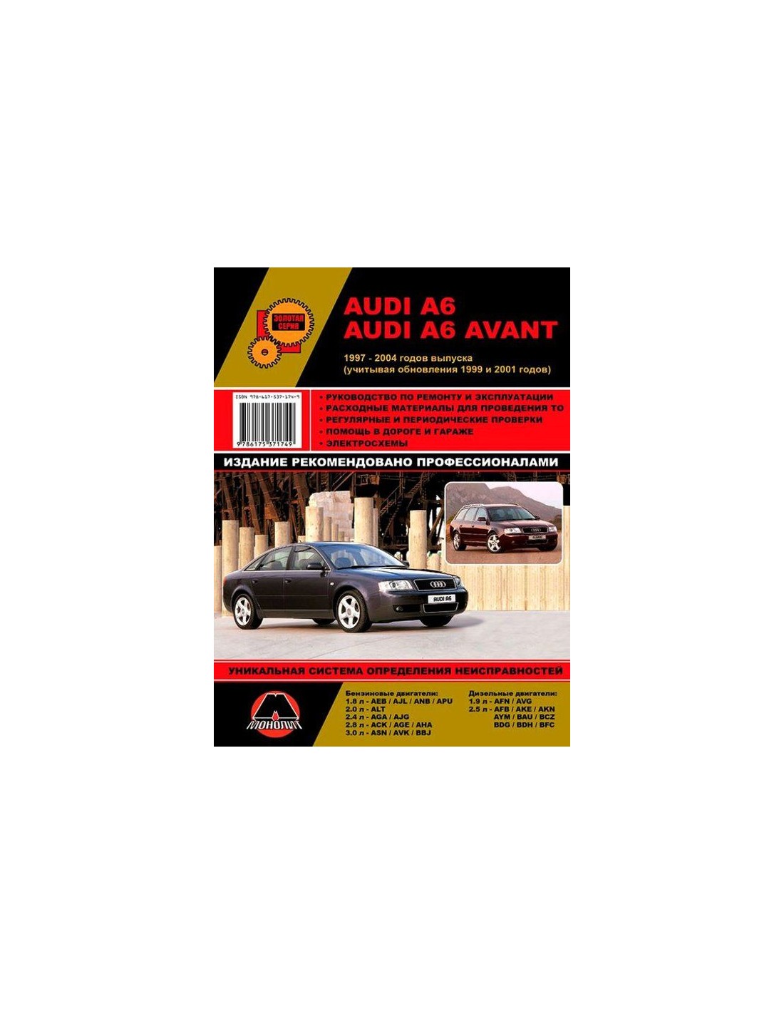 Книга по ремонту Audi A6 / A6 Avant с 1997-04 г ,содержит руководство по эксплуатации,подробные сведения по техническому обслуживанию автомобиля,диагностике ремонту и регулировке элементов систем двигателя,в том числе электронного управления двигателем,систему смазки и охлаждения,запуска и зарядки,элементов механических и автоматических коробок передач,раздаточной коробки,тормозной системы,включая антиблокировочную систему тормозов,рулевого управления,подвески,кузовных элементов, систем кондиционирования и вентиляции.