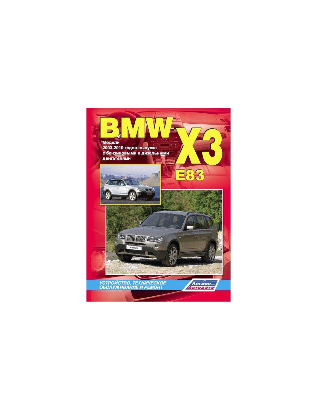 Устройство автомобиля,возможные неисправности и методы их устранения, сопрягаемые размеры основных деталей и пределы их допустимого износа,рекомендуемое смазочные материалы,рабочие жидкости и каталожные номера расходных запчастей,необходимых для технического обслуживания,размеры рекомендуемых и допускаемых шин и дисков-все это можно найти на страницах издания "Легион-Автодата" Книга автомобильная на BMW X3 (E83) 2003-10 г.