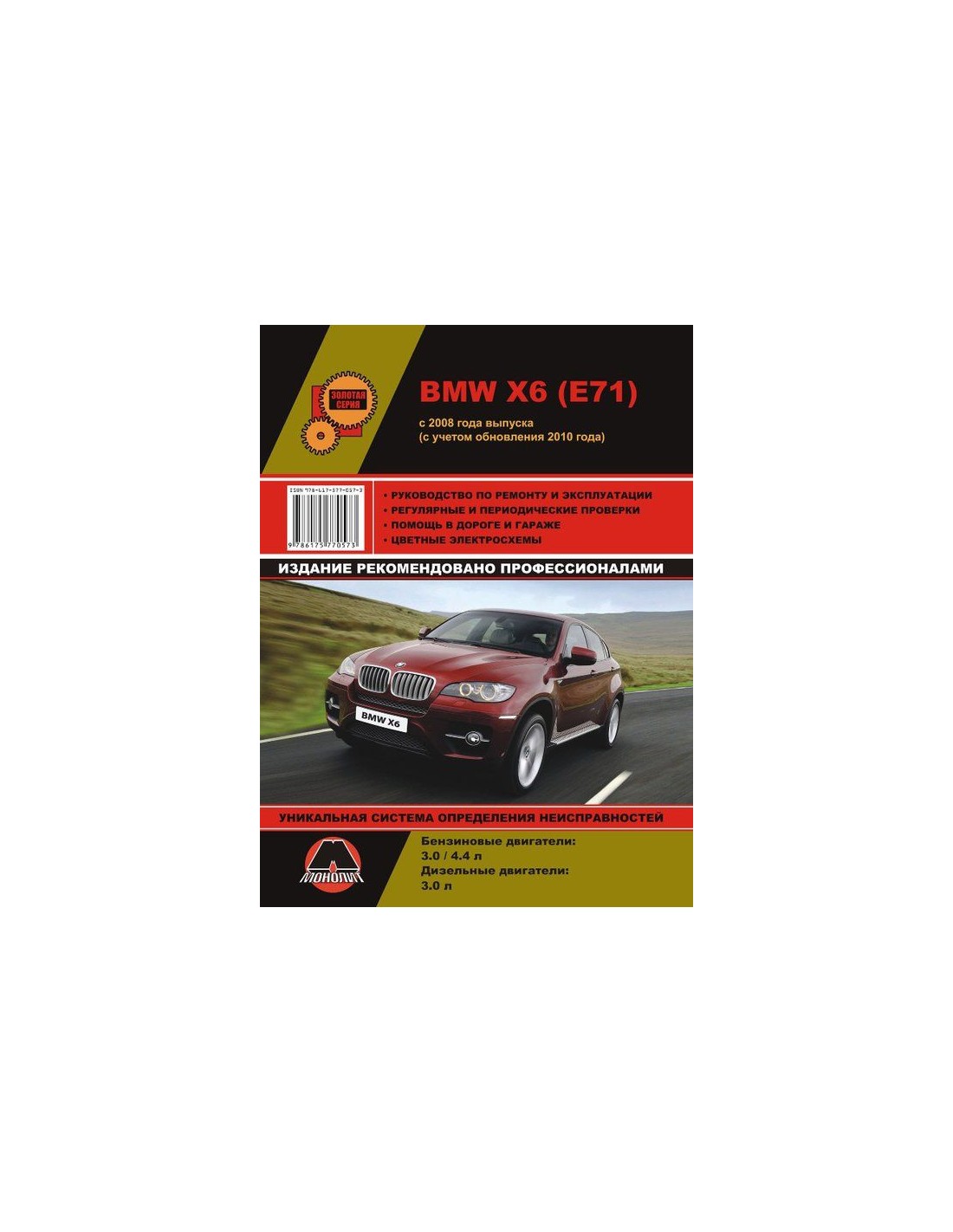 Книга по ремонту BMW X6 (E71) c 2008 г ,содержит руководство по эксплуатации,подробные сведения по техническому обслуживанию автомобиля,диагностике ремонту и регулировке элементов систем двигателя,в том числе электронного управления двигателем,систему смазки и охлаждения,запуска и зарядки,элементов механических и автоматических коробок передач,раздаточной коробки,тормозной системы,включая антиблокировочную систему тормозов,рулевого управления,подвески,кузовных элементов, систем кондиционирования и вентиляции.