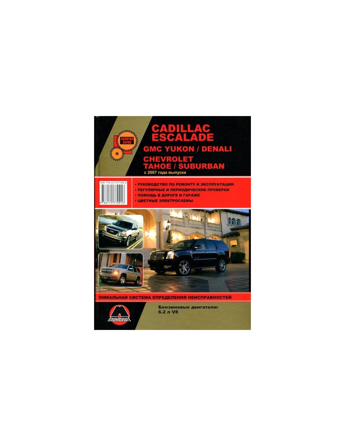 Книга по ремонту CADILLAC ESCALADE/GMC YUKON/DENALI/CHEVROLET TAHOE/SUBURBAN с 2007г ,содержит руководство по эксплуатации,подробные сведения по техническому обслуживанию автомобиля,диагностике ремонту и регулировке элементов систем двигателя,в том числе электронного управления двигателем,систему смазки и охлаждения,запуска и зарядки,элементов механических и автоматических коробок передач,раздаточной коробки,тормозной системы,включая антиблокировочную систему тормозов,рулевого управления,подвески,кузовных элементов, систем кондиционирования и вентиляции.