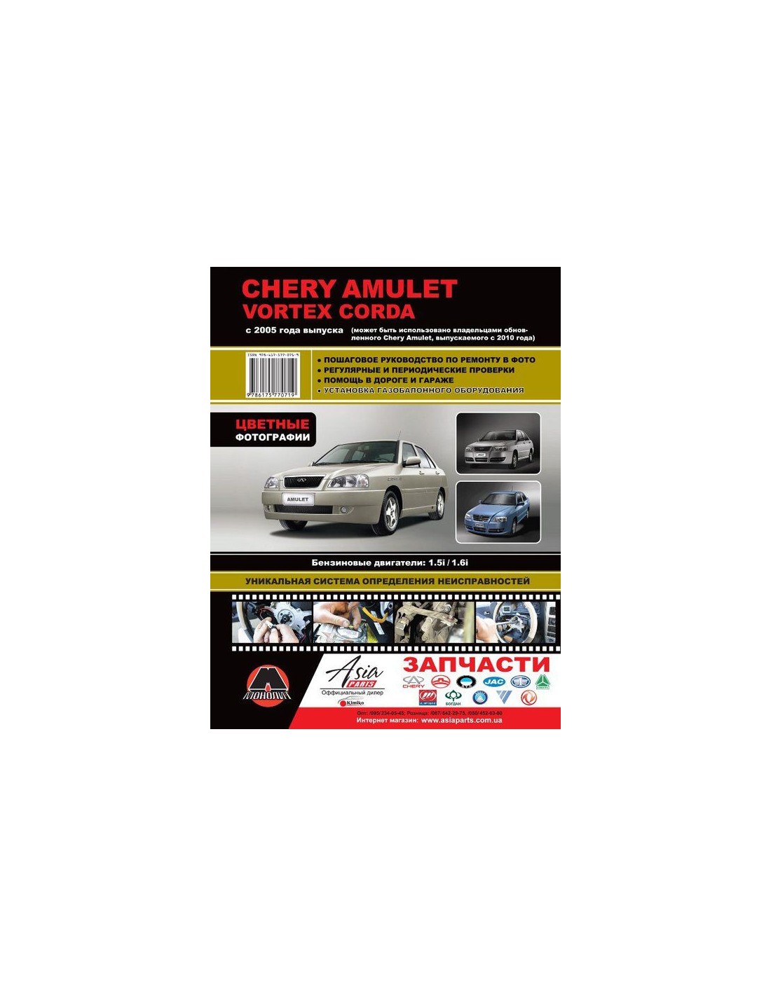 Книга по ремонту Chery Amulet / Vortex Corda (с 2005/с 2010) ,содержит руководство по эксплуатации,подробные сведения по техническому обслуживанию автомобиля,диагностике ремонту и регулировке элементов систем двигателя,в том числе электронного управления двигателем,систему смазки и охлаждения,запуска и зарядки,элементов механических и автоматических коробок передач,раздаточной коробки,тормозной системы,включая антиблокировочную систему тормозов,рулевого управления,подвески,кузовных элементов, систем кондиционирования и вентиляции.