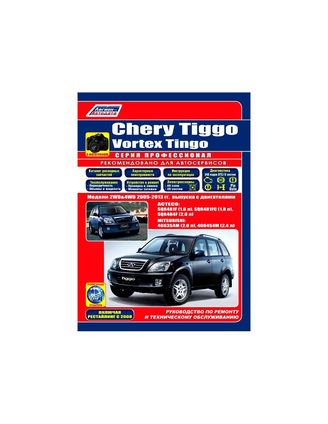 Книга по ремонту Chery Tiggo & Vortex Tingo 2005-13 г.,содержит руководство по эксплуатации,подробные сведения по техническому обслуживанию автомобиля,диагностике ремонту и регулировке элементов систем двигателя,в том числе электронного управления двигателем,систему смазки и охлаждения,запуска и зарядки,элементов механических и автоматических коробок передач,раздаточной коробки,тормозной системы,включая антиблокировочную систему тормозов,рулевого управления,подвески,кузовных элементов, систем кондиционирования и вентиляции.