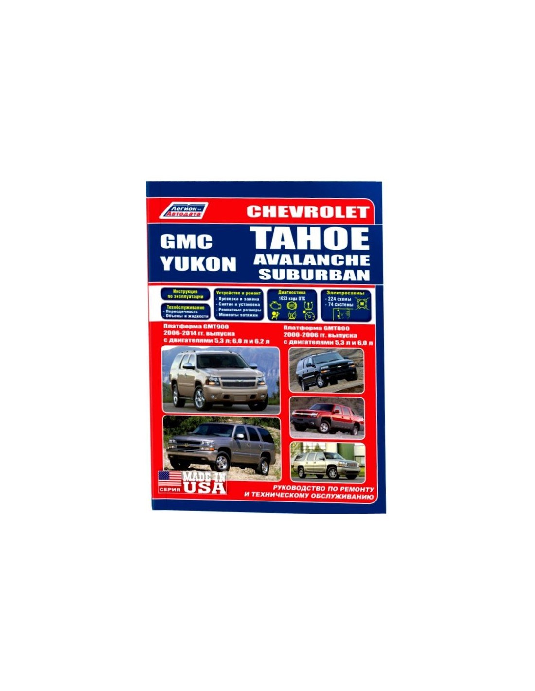 Книга по ремонту Chevrolet Tahoe/Avalanche/Suburban/GMС Yukon/GMT800 2000-06/GMT900 c 2006 г.,содержит руководство по эксплуатации,подробные сведения по техническому обслуживанию автомобиля,диагностике ремонту и регулировке элементов систем двигателя,в том числе электронного управления двигателем,систему смазки и охлаждения,запуска и зарядки,элементов механических и автоматических коробок передач,раздаточной коробки,тормозной системы,включая антиблокировочную систему тормозов,рулевого управления,подвески,кузовных элементов, систем кондиционирования и вентиляции.