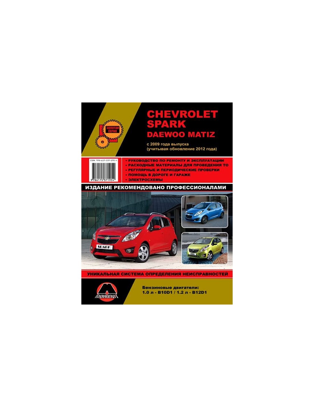 Книга по ремонту Chevrolet Spark/Daewoo Matiz рем ,содержит руководство по эксплуатации,подробные сведения по техническому обслуживанию автомобиля,диагностике ремонту и регулировке элементов систем двигателя,в том числе электронного управления двигателем,систему смазки и охлаждения,запуска и зарядки,элементов механических и автоматических коробок передач,раздаточной коробки,тормозной системы,включая антиблокировочную систему тормозов,рулевого управления,подвески,кузовных элементов, систем кондиционирования и вентиляции.