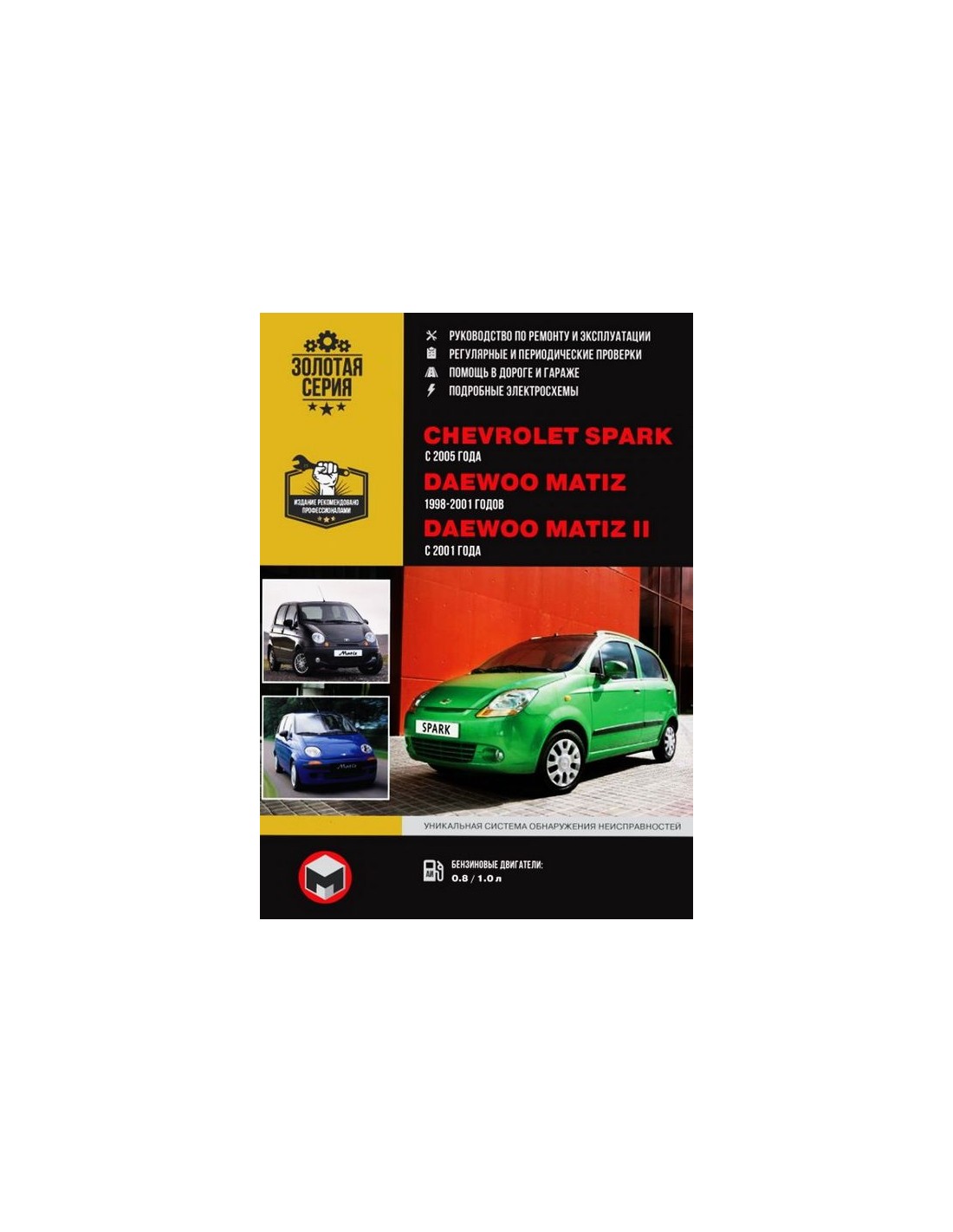 Книга по ремонту Chevrolet Spark/Daewoo Matiz/Matiz II рем ,содержит руководство по эксплуатации,подробные сведения по техническому обслуживанию автомобиля,диагностике ремонту и регулировке элементов систем двигателя,в том числе электронного управления двигателем,систему смазки и охлаждения,запуска и зарядки,элементов механических и автоматических коробок передач,раздаточной коробки,тормозной системы,включая антиблокировочную систему тормозов,рулевого управления,подвески,кузовных элементов, систем кондиционирования и вентиляции.