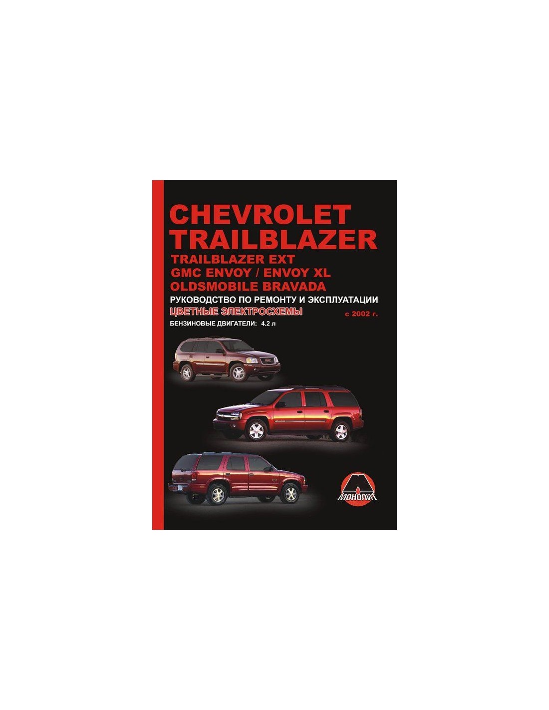 Книга по ремонту Chevrolet TrailBlazer/EXT/GMC Envoy/XL/Oldsmobile Bravada с 2002г ,содержит руководство по эксплуатации,подробные сведения по техническому обслуживанию автомобиля,диагностике ремонту и регулировке элементов систем двигателя,в том числе электронного управления двигателем,систему смазки и охлаждения,запуска и зарядки,элементов механических и автоматических коробок передач,раздаточной коробки,тормозной системы,включая антиблокировочную систему тормозов,рулевого управления,подвески,кузовных элементов, систем кондиционирования и вентиляции.
