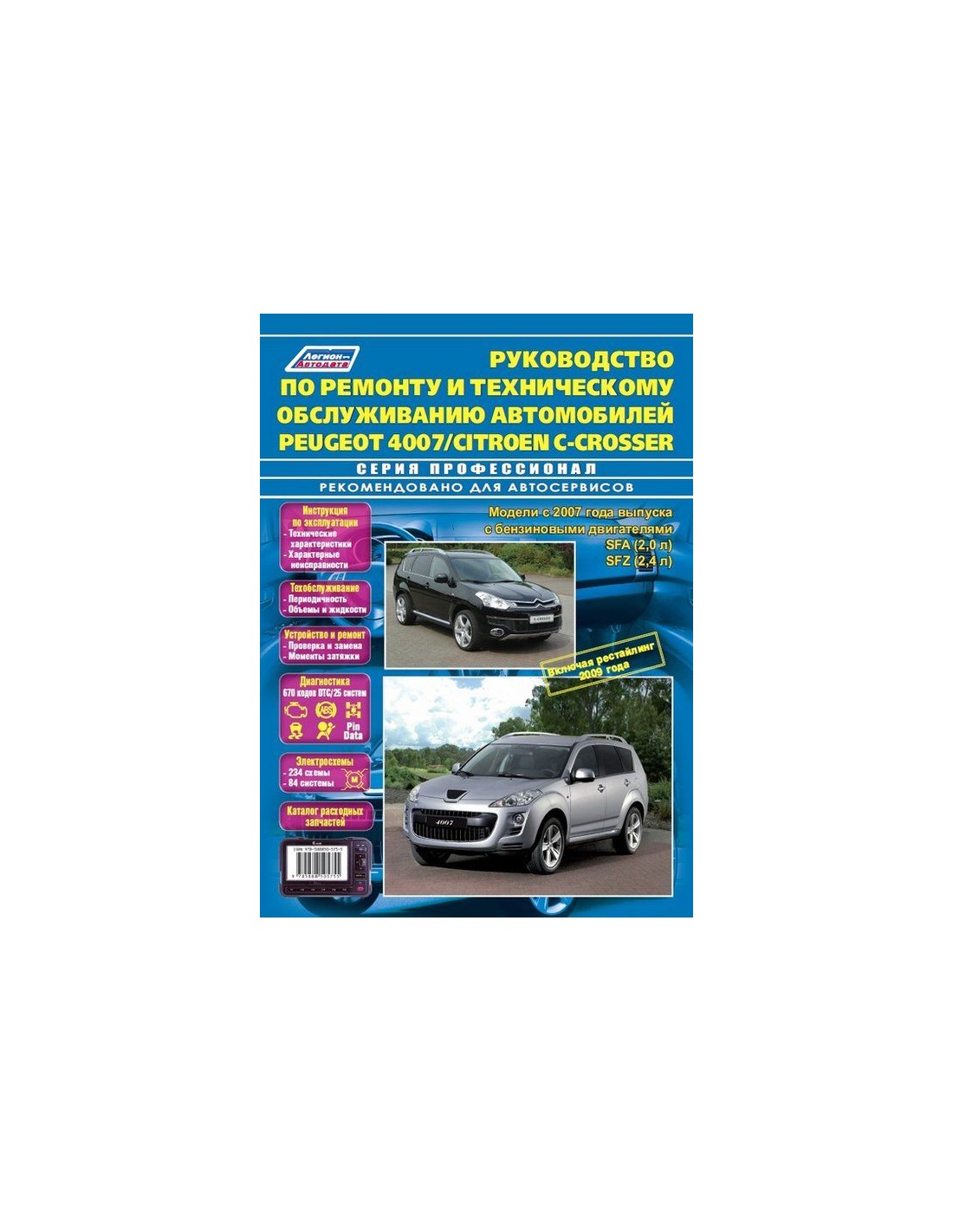 Книга по ремонту Peugeot 4007 / Citroen C-Crosser с 2007 г.,содержит руководство по эксплуатации,подробные сведения по техническому обслуживанию автомобиля,диагностике ремонту и регулировке элементов систем двигателя,в том числе электронного управления двигателем,систему смазки и охлаждения,запуска и зарядки,элементов механических и автоматических коробок передач,раздаточной коробки,тормозной системы,включая антиблокировочную систему тормозов,рулевого управления,подвески,кузовных элементов, систем кондиционирования и вентиляции.