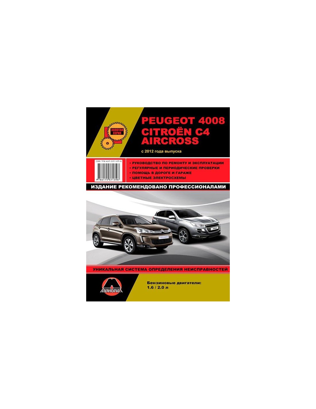 Книга по ремонту Peugeot 4008 / Citroen C4 Aircross с 2012 ,содержит руководство по эксплуатации,подробные сведения по техническому обслуживанию автомобиля,диагностике ремонту и регулировке элементов систем двигателя,в том числе электронного управления двигателем,систему смазки и охлаждения,запуска и зарядки,элементов механических и автоматических коробок передач,раздаточной коробки,тормозной системы,включая антиблокировочную систему тормозов,рулевого управления,подвески,кузовных элементов, систем кондиционирования и вентиляции.