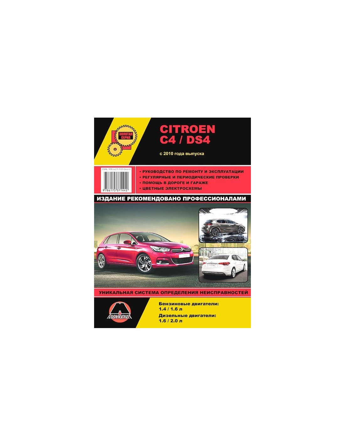 Книга по ремонту Citroen C4/DS4 (с 2010) ,содержит руководство по эксплуатации,подробные сведения по техническому обслуживанию автомобиля,диагностике ремонту и регулировке элементов систем двигателя,в том числе электронного управления двигателем,систему смазки и охлаждения,запуска и зарядки,элементов механических и автоматических коробок передач,раздаточной коробки,тормозной системы,включая антиблокировочную систему тормозов,рулевого управления,подвески,кузовных элементов, систем кондиционирования и вентиляции.