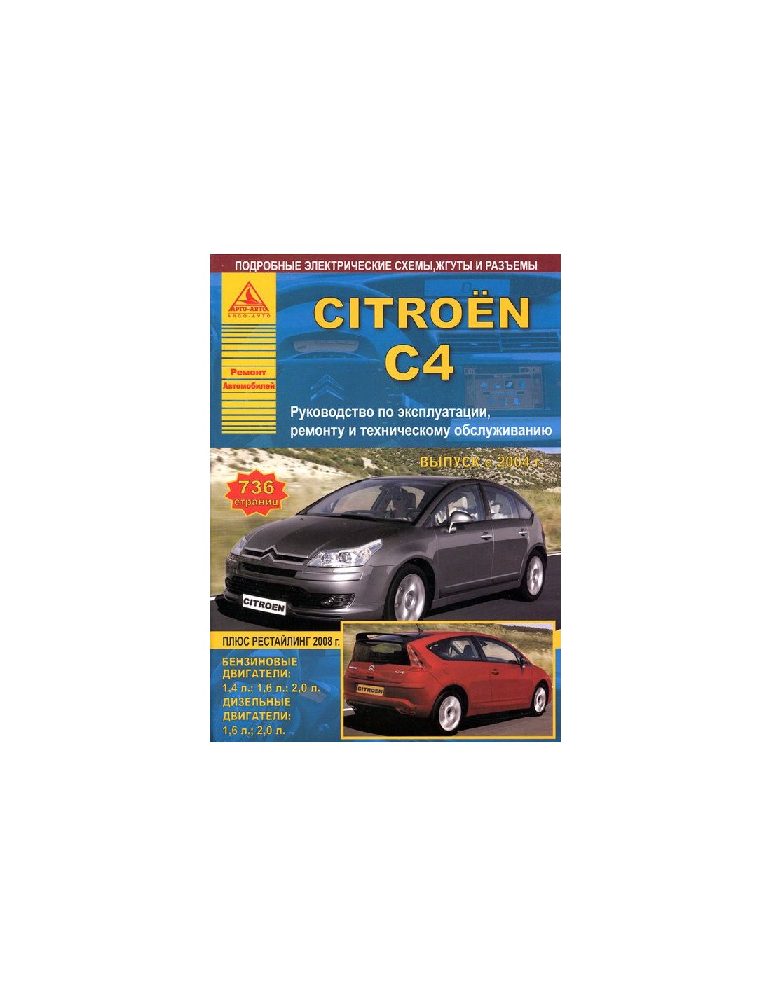 Книга по ремонту Citroen C4 2004-10, рестайл. 2008 г.,содержит руководство по эксплуатации,подробные сведения по техническому обслуживанию автомобиля,систему смазки и охлаждения,запуска и зарядки,элементов механических и автоматических коробок передач,тормозной системы,включая антиблокировочную систему тормозов,рулевого управления,подвески,кузовных элементов, систем кондиционирования и вентиляции.