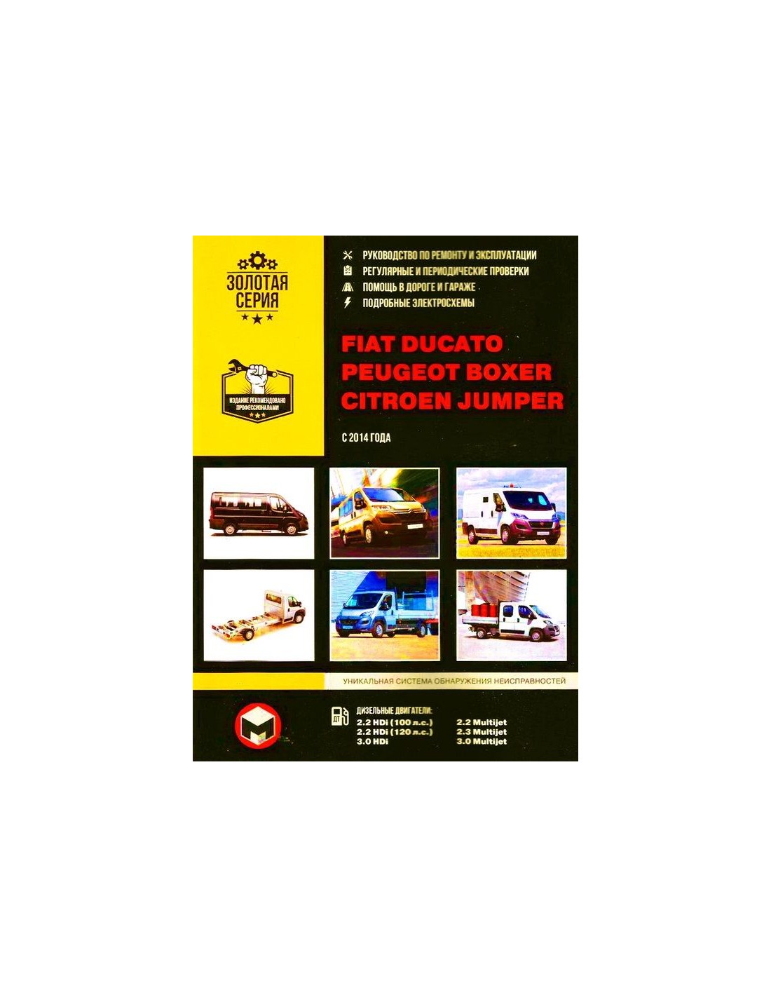Книга по ремонту Fiat Ducato / Peugeot Boxer / Citroen Jumper с 2014 ,содержит руководство по эксплуатации,подробные сведения по техническому обслуживанию автомобиля,диагностике ремонту и регулировке элементов систем двигателя,в том числе электронного управления двигателем,систему смазки и охлаждения,запуска и зарядки,элементов механических и автоматических коробок передач,раздаточной коробки,тормозной системы,включая антиблокировочную систему тормозов,рулевого управления,подвески,кузовных элементов, систем кондиционирования и вентиляции.