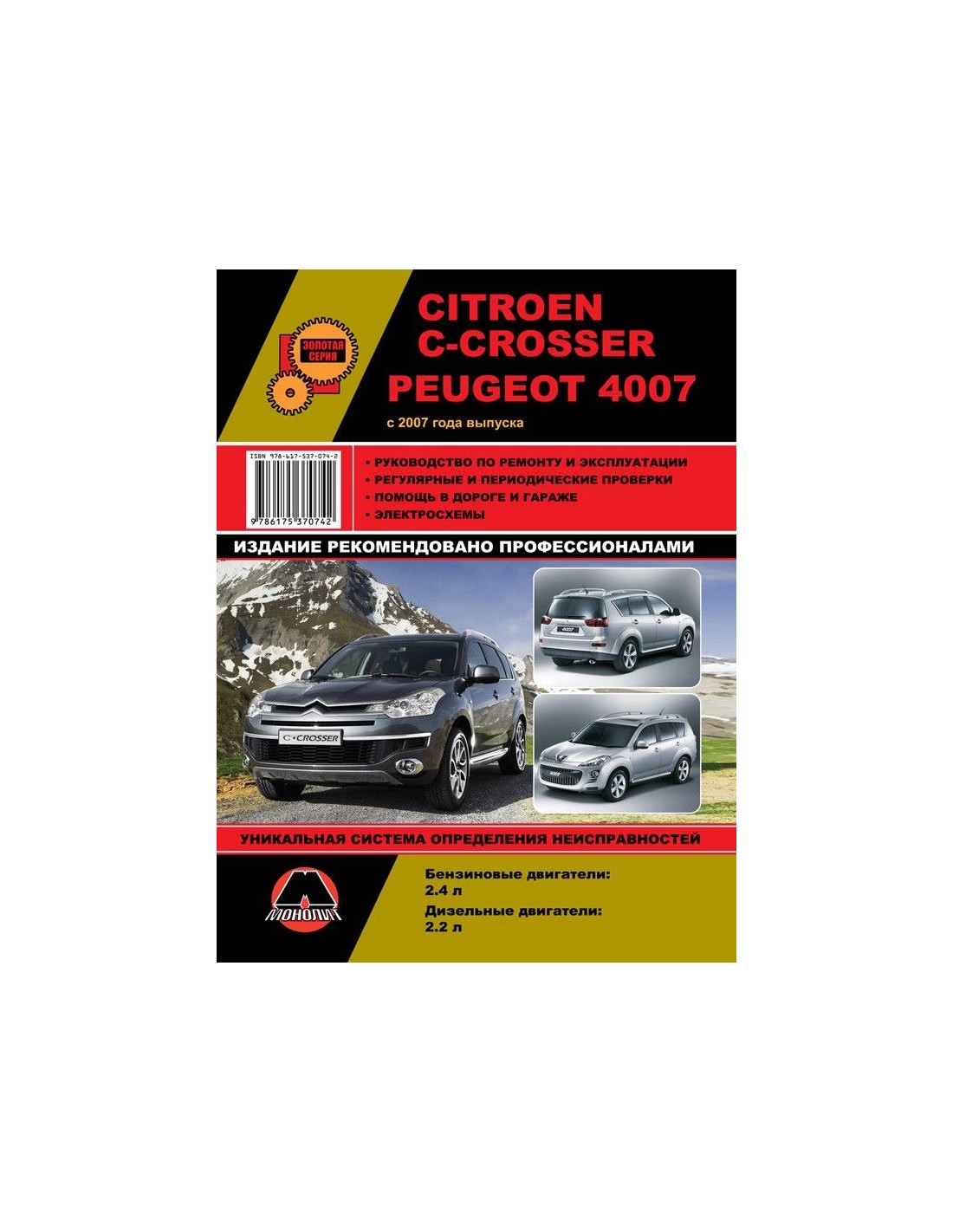 Книга по ремонту Citroen C-Crosser / Peugeot 4007 c 2007 г ,содержит руководство по эксплуатации,подробные сведения по техническому обслуживанию автомобиля,диагностике ремонту и регулировке элементов систем двигателя,в том числе электронного управления двигателем,систему смазки и охлаждения,запуска и зарядки,элементов механических и автоматических коробок передач,раздаточной коробки,тормозной системы,включая антиблокировочную систему тормозов,рулевого управления,подвески,кузовных элементов, систем кондиционирования и вентиляции.