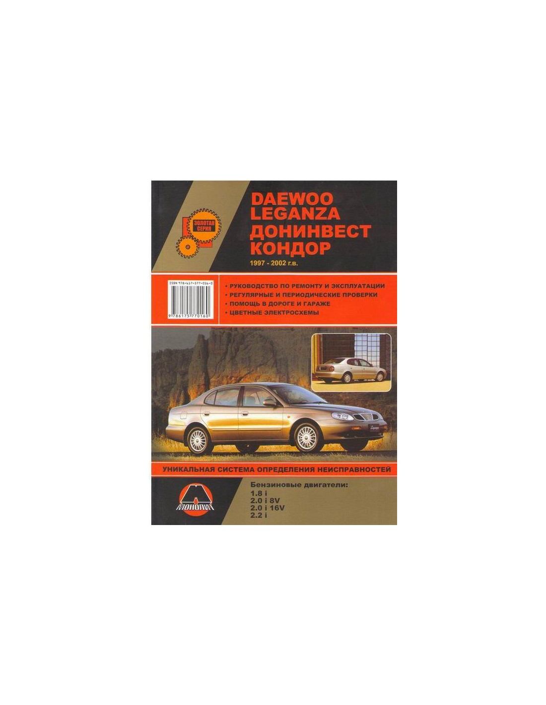 Книга по ремонту Daewoo Leganza / Донинвест Кондор (1997-02) ,содержит руководство по эксплуатации,подробные сведения по техническому обслуживанию автомобиля,диагностике ремонту и регулировке элементов систем двигателя,в том числе электронного управления двигателем,систему смазки и охлаждения,запуска и зарядки,элементов механических и автоматических коробок передач,раздаточной коробки,тормозной системы,включая антиблокировочную систему тормозов,рулевого управления,подвески,кузовных элементов, систем кондиционирования и вентиляции.