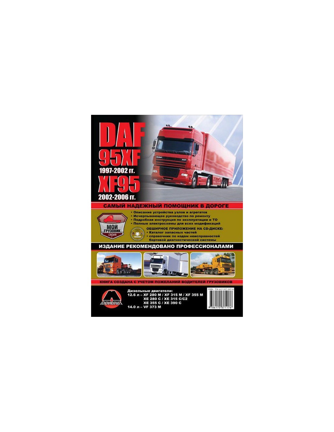 Транспортная книга будет полезна как начинающим,так и профессионалам авторемонта и диагностики.Собранная в данном руководстве информация позволит владельцу автомобиля определиться с тем,когда и какие виды работ по обслуживанию,ремонту транспортного средства,должны производиться.Следует понимать,что данная книга не сделает автомехаником человека,не сталкивающегося ранее с устройством автомобиля.Однако описание тех или иных ремонтных операций позволит трезво оценить свои возможности и,вероятно,некоторые неисправности устранить самостоятельно.В случае,если выполнение ремонта своими силами окажется затруднительным,читатели данного руководства все же будет иметь представление об объем необходимых работ,что защитит его от возможного обмана и лишних затрат.Автомеханику книга даст возможность выполнить ремонт быстро и без осложнений.Профессионалам будут полезны Ремонт DAF 95XF c 1997-2002г/ХF 95 с 2002-2006 г и руковоство по настройке,допустимые размеры деталей, адаптация, сброс настроек, необходимые после ремонта, данные по диагностике и подробные схемы электрооборудования.