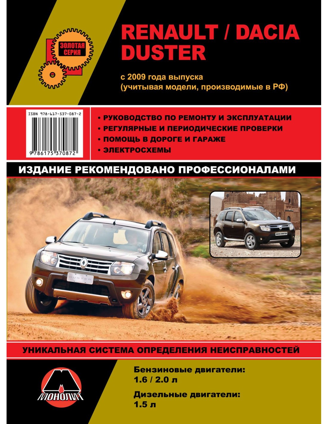 Книга по ремонту Renault / Dacia Duster цв/сх с 2009 г ,содержит руководство по эксплуатации,подробные сведения по техническому обслуживанию автомобиля,диагностике ремонту и регулировке элементов систем двигателя,в том числе электронного управления двигателем,систему смазки и охлаждения,запуска и зарядки,элементов механических и автоматических коробок передач,раздаточной коробки,тормозной системы,включая антиблокировочную систему тормозов,рулевого управления,подвески,кузовных элементов, систем кондиционирования и вентиляции.