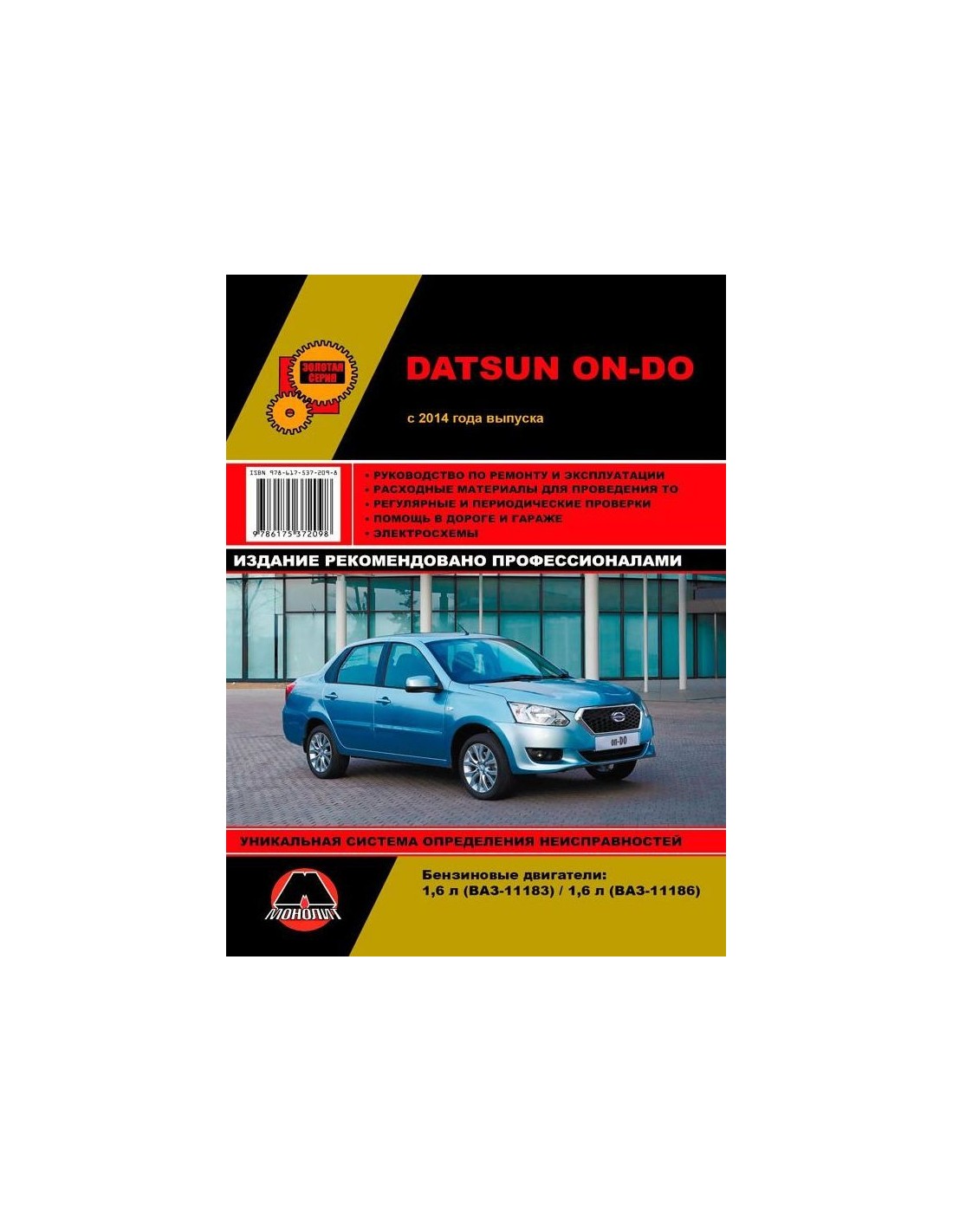 Устройство автомобиля,возможные неисправности и методы их устранения, сопрягаемые размеры основных деталей и пределы их допустимого износа,рекомендуемое смазочные материалы,рабочие жидкости и каталожные номера расходных запчастей,необходимых для технического обслуживания,размеры рекомендуемых и допускаемых шин и дисков-все это можно найти на страницах издания "Монолит" Книга автомобильная на Datsun On-Do с 2014г