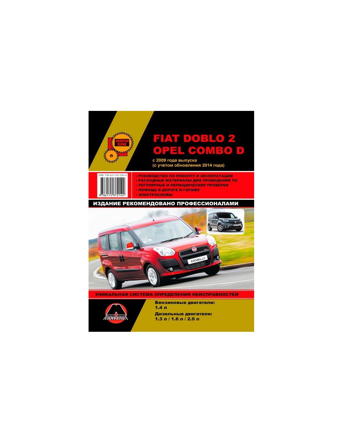 Книга по ремонту Fiat Doblo 2 / Opel Combo D с 2009 (+рестайлинг 2014) ,содержит руководство по эксплуатации,подробные сведения по техническому обслуживанию автомобиля,диагностике ремонту и регулировке элементов систем двигателя,в том числе электронного управления двигателем,систему смазки и охлаждения,запуска и зарядки,элементов механических и автоматических коробок передач,раздаточной коробки,тормозной системы,включая антиблокировочную систему тормозов,рулевого управления,подвески,кузовных элементов, систем кондиционирования и вентиляции.