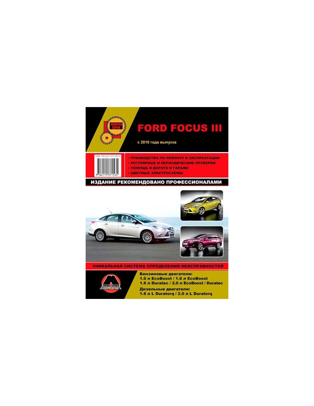 Книга по ремонту Ford Focus III с 2010 ,содержит руководство по эксплуатации,подробные сведения по техническому обслуживанию автомобиля,диагностике ремонту и регулировке элементов систем двигателя,в том числе электронного управления двигателем,систему смазки и охлаждения,запуска и зарядки,элементов механических и автоматических коробок передач,раздаточной коробки,тормозной системы,включая антиблокировочную систему тормозов,рулевого управления,подвески,кузовных элементов, систем кондиционирования и вентиляции.