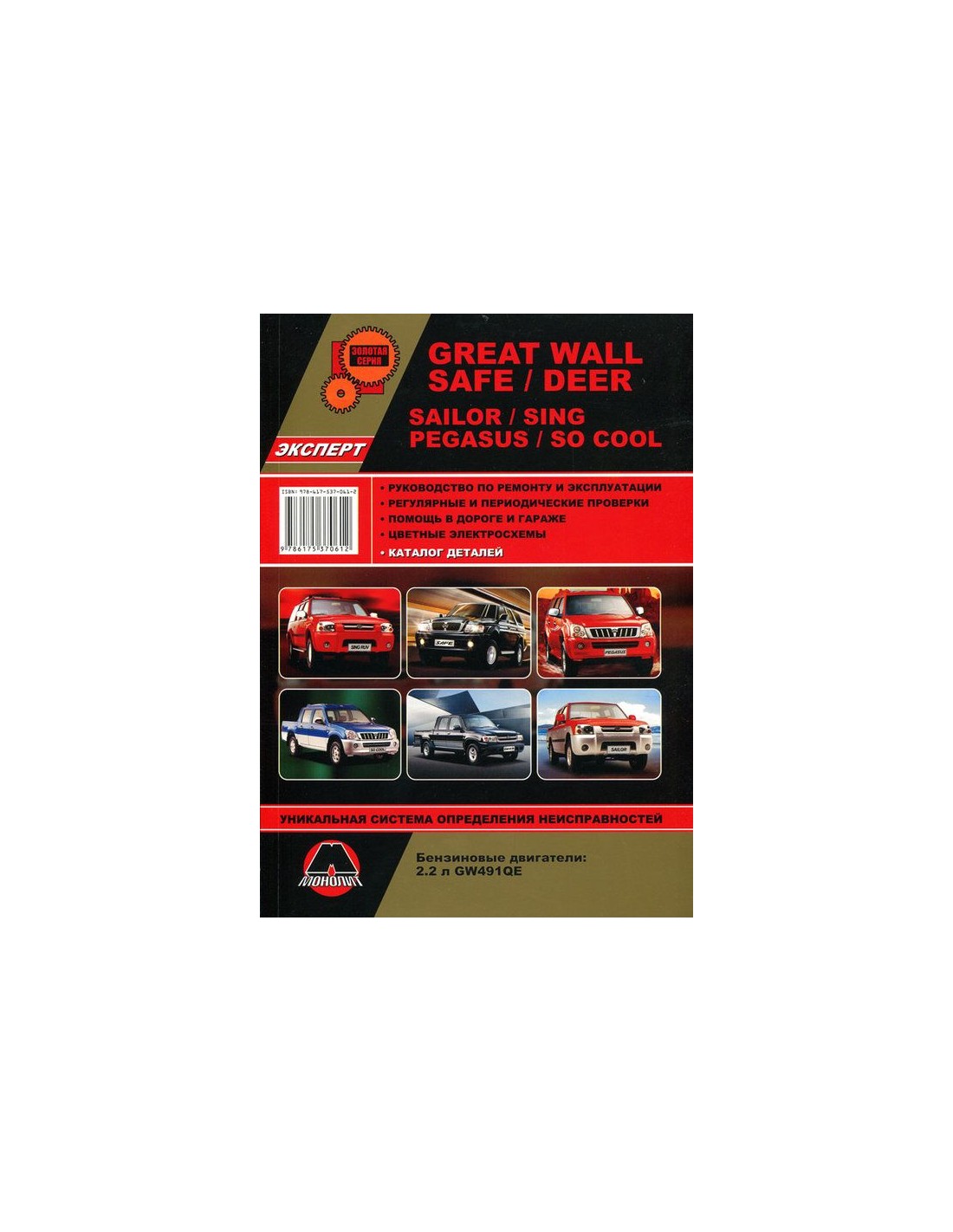 Книга по ремонту Great Wall Safe/Deer/Sailor/Sing RUV/Pegasus ,содержит руководство по эксплуатации,подробные сведения по техническому обслуживанию автомобиля,диагностике ремонту и регулировке элементов систем двигателя,в том числе электронного управления двигателем,систему смазки и охлаждения,запуска и зарядки,элементов механических и автоматических коробок передач,раздаточной коробки,тормозной системы,включая антиблокировочную систему тормозов,рулевого управления,подвески,кузовных элементов, систем кондиционирования и вентиляции.