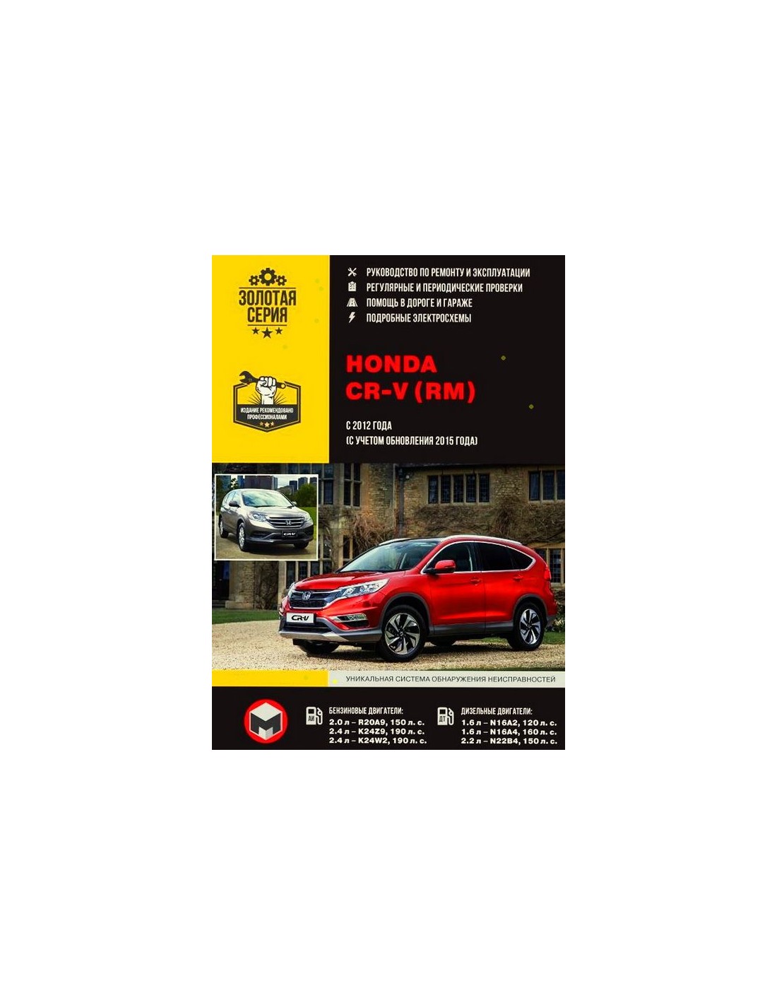 Устройство автомобиля,возможные неисправности и методы их устранения, сопрягаемые размеры основных деталей и пределы их допустимого износа,рекомендуемое смазочные материалы,рабочие жидкости и каталожные номера расходных запчастей,необходимых для технического обслуживания,размеры рекомендуемых и допускаемых шин и дисков-все это можно найти на страницах издания "Монолит" Книга автомобильная на Honda CR-V с 2012