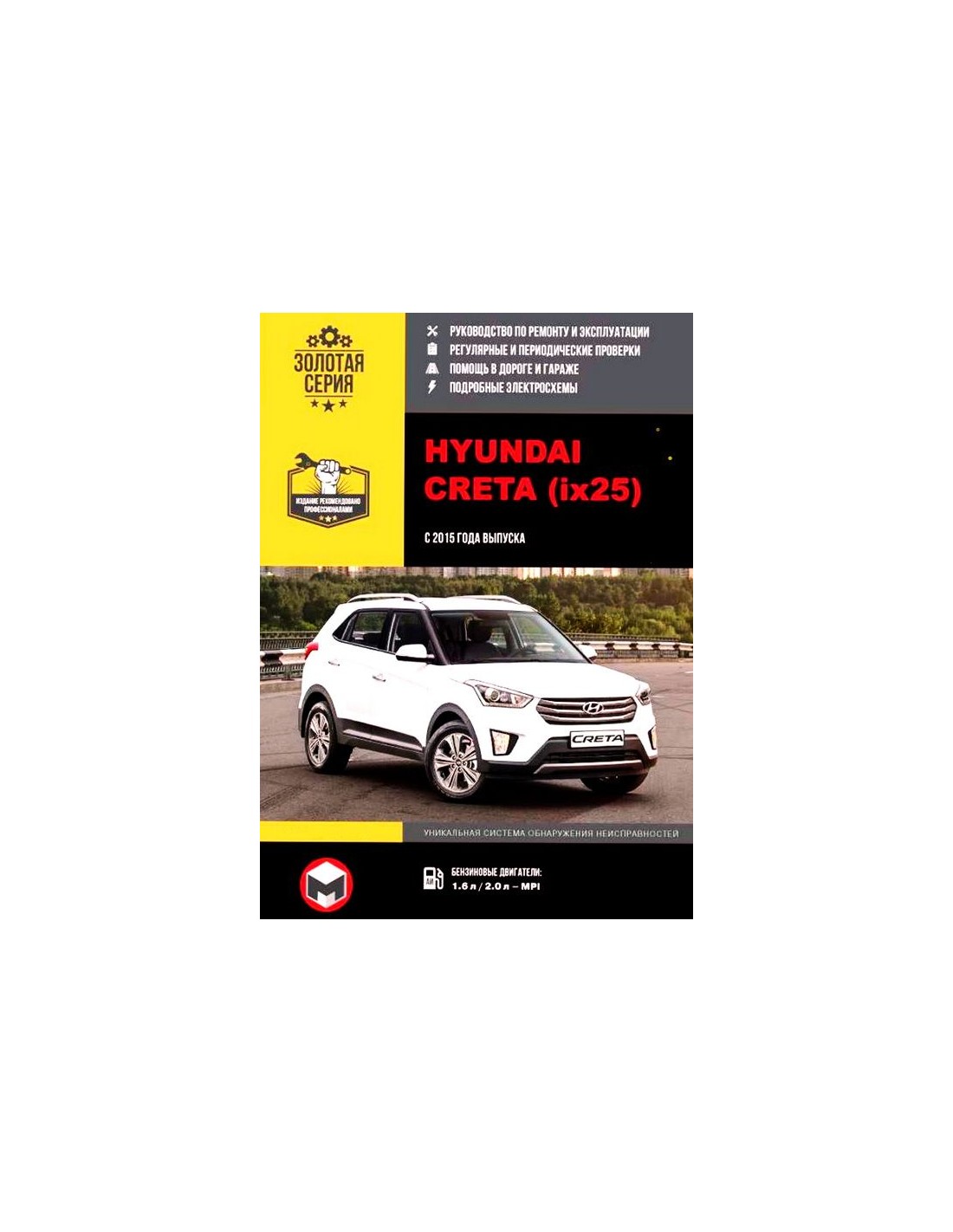 Книга по ремонту Hyundai СRETA ( ix 25) c 2015г ,содержит руководство по эксплуатации,подробные сведения по техническому обслуживанию автомобиля,диагностике ремонту и регулировке элементов систем двигателя,в том числе электронного управления двигателем,систему смазки и охлаждения,запуска и зарядки,элементов механических и автоматических коробок передач,раздаточной коробки,тормозной системы,включая антиблокировочную систему тормозов,рулевого управления,подвески,кузовных элементов, систем кондиционирования и вентиляции.
