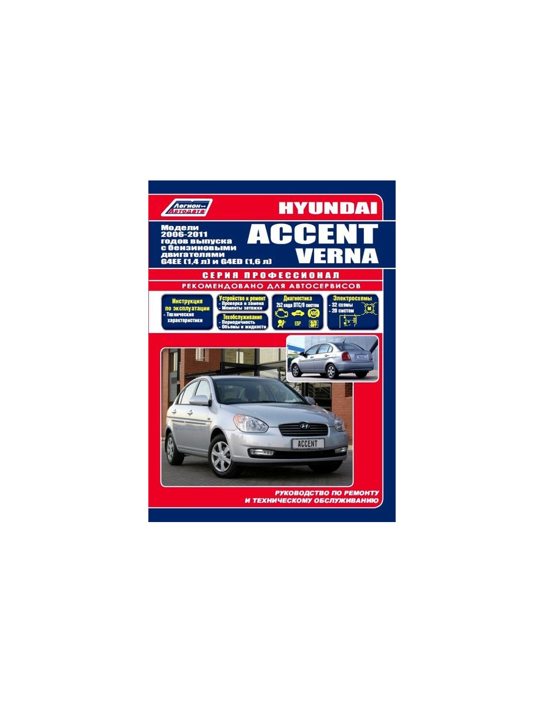 Книга по ремонту Hyundai Accent/Verna 2006-11 г.,содержит руководство по эксплуатации,подробные сведения по техническому обслуживанию автомобиля,диагностике ремонту и регулировке элементов систем двигателя,в том числе электронного управления двигателем,систему смазки и охлаждения,запуска и зарядки,элементов механических и автоматических коробок передач,раздаточной коробки,тормозной системы,включая антиблокировочную систему тормозов,рулевого управления,подвески,кузовных элементов, систем кондиционирования и вентиляции.