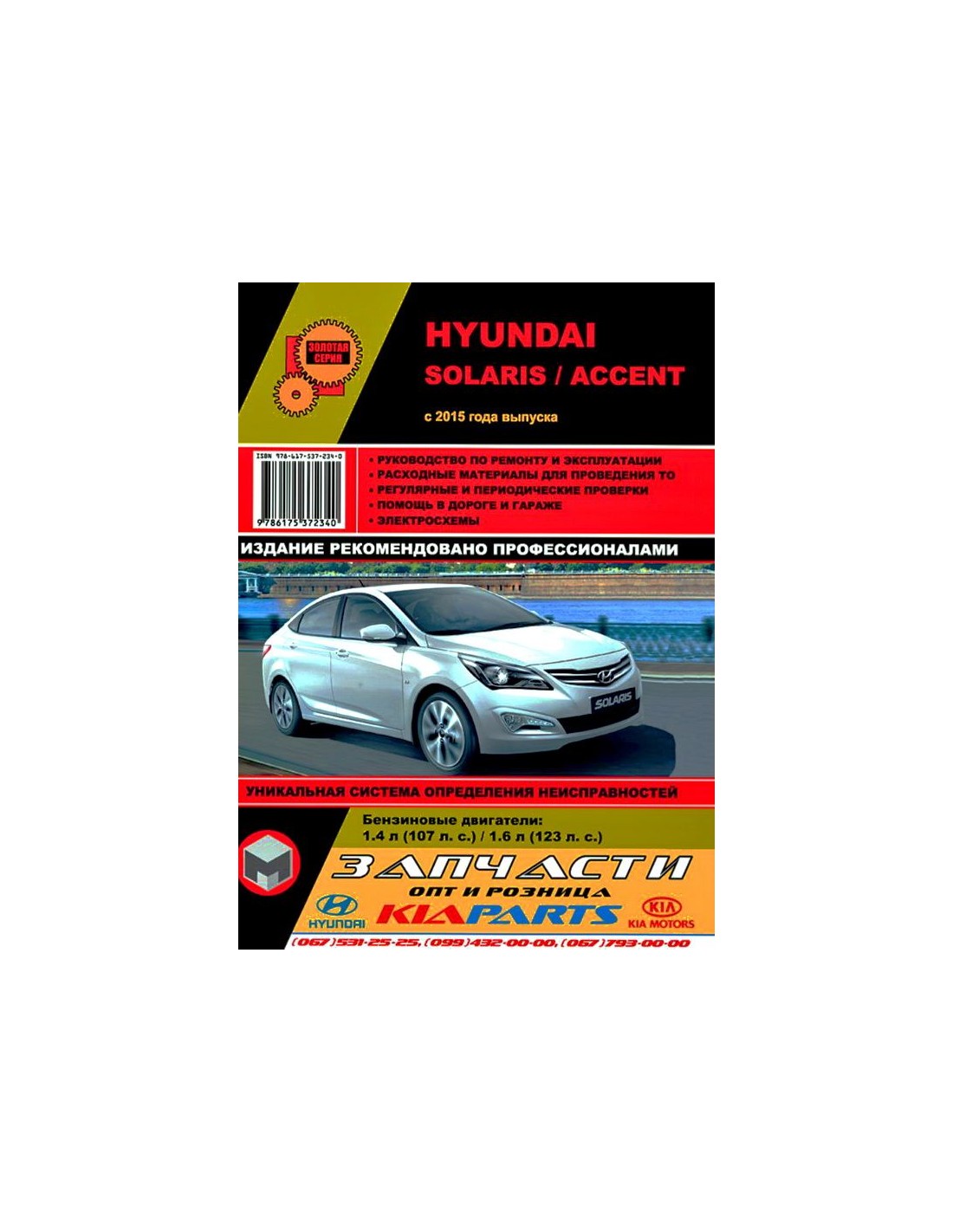 Книга по ремонту Hyundai Solaris с 2015 ,содержит руководство по эксплуатации,подробные сведения по техническому обслуживанию автомобиля,диагностике ремонту и регулировке элементов систем двигателя,в том числе электронного управления двигателем,систему смазки и охлаждения,запуска и зарядки,элементов механических и автоматических коробок передач,раздаточной коробки,тормозной системы,включая антиблокировочную систему тормозов,рулевого управления,подвески,кузовных элементов, систем кондиционирования и вентиляции.