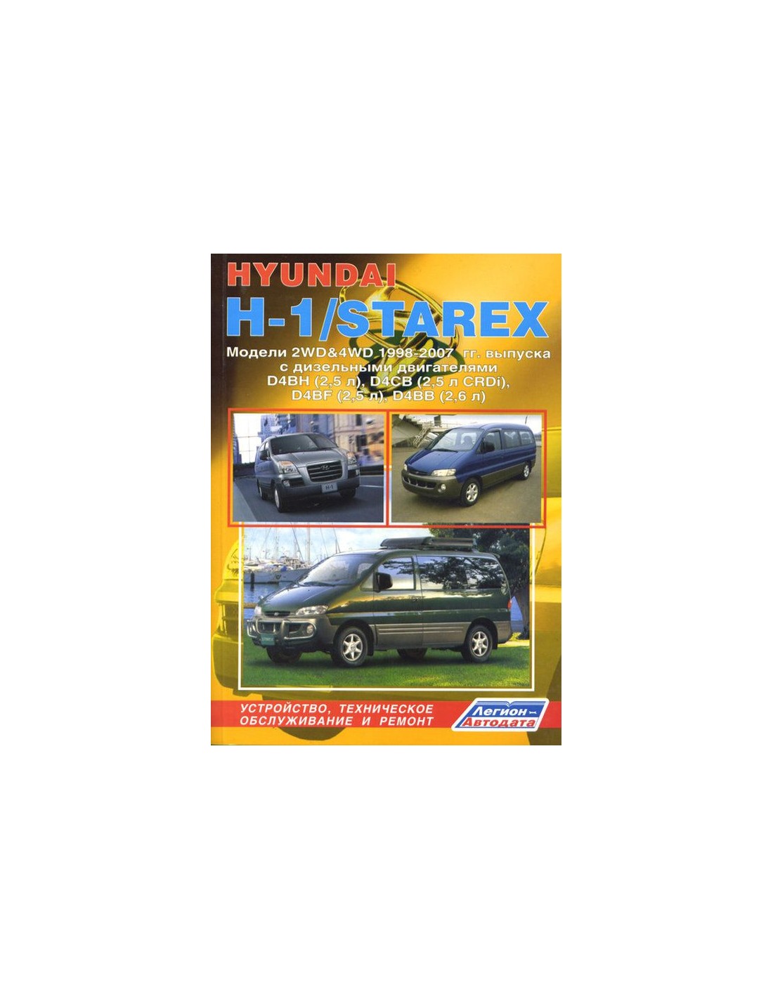 Книга по ремонту Hyundai H-1/Starex 2WD&4WD 1998-07 г.,содержит руководство по эксплуатации,подробные сведения по техническому обслуживанию автомобиля,диагностике ремонту и регулировке элементов систем двигателя,в том числе электронного управления двигателем,систему смазки и охлаждения,запуска и зарядки,элементов механических и автоматических коробок передач,раздаточной коробки,тормозной системы,включая антиблокировочную систему тормозов,рулевого управления,подвески,кузовных элементов, систем кондиционирования и вентиляции.