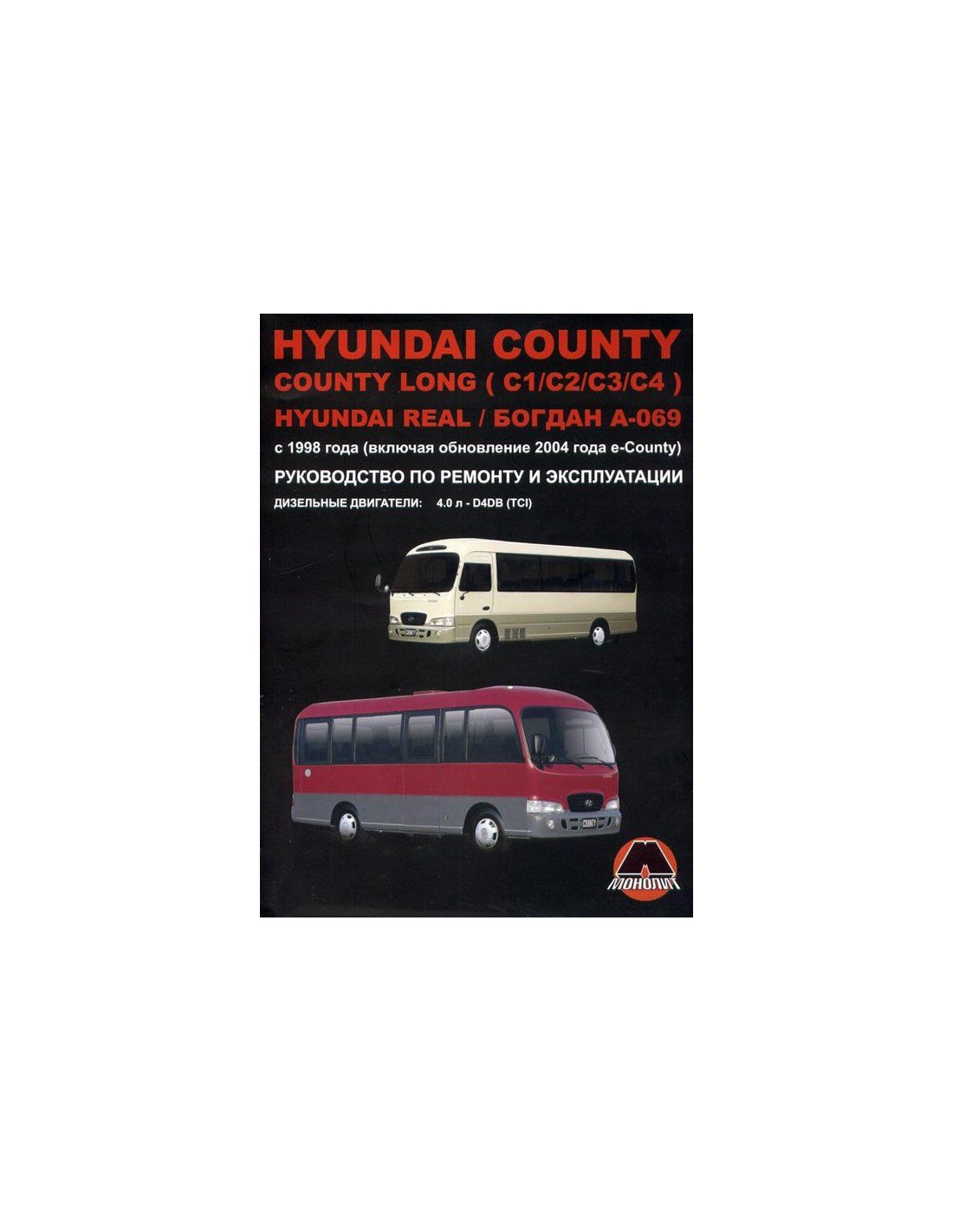 Книга по ремонту Hyundai County Long(C1/C2/C3/C4)/Real/Богдан А-069 с 1998г ,содержит руководство по эксплуатации,подробные сведения по техническому обслуживанию автомобиля,диагностике ремонту и регулировке элементов систем двигателя,в том числе электронного управления двигателем,систему смазки и охлаждения,запуска и зарядки,элементов механических и автоматических коробок передач,раздаточной коробки,тормозной системы,включая антиблокировочную систему тормозов,рулевого управления,подвески,кузовных элементов, систем кондиционирования и вентиляции.