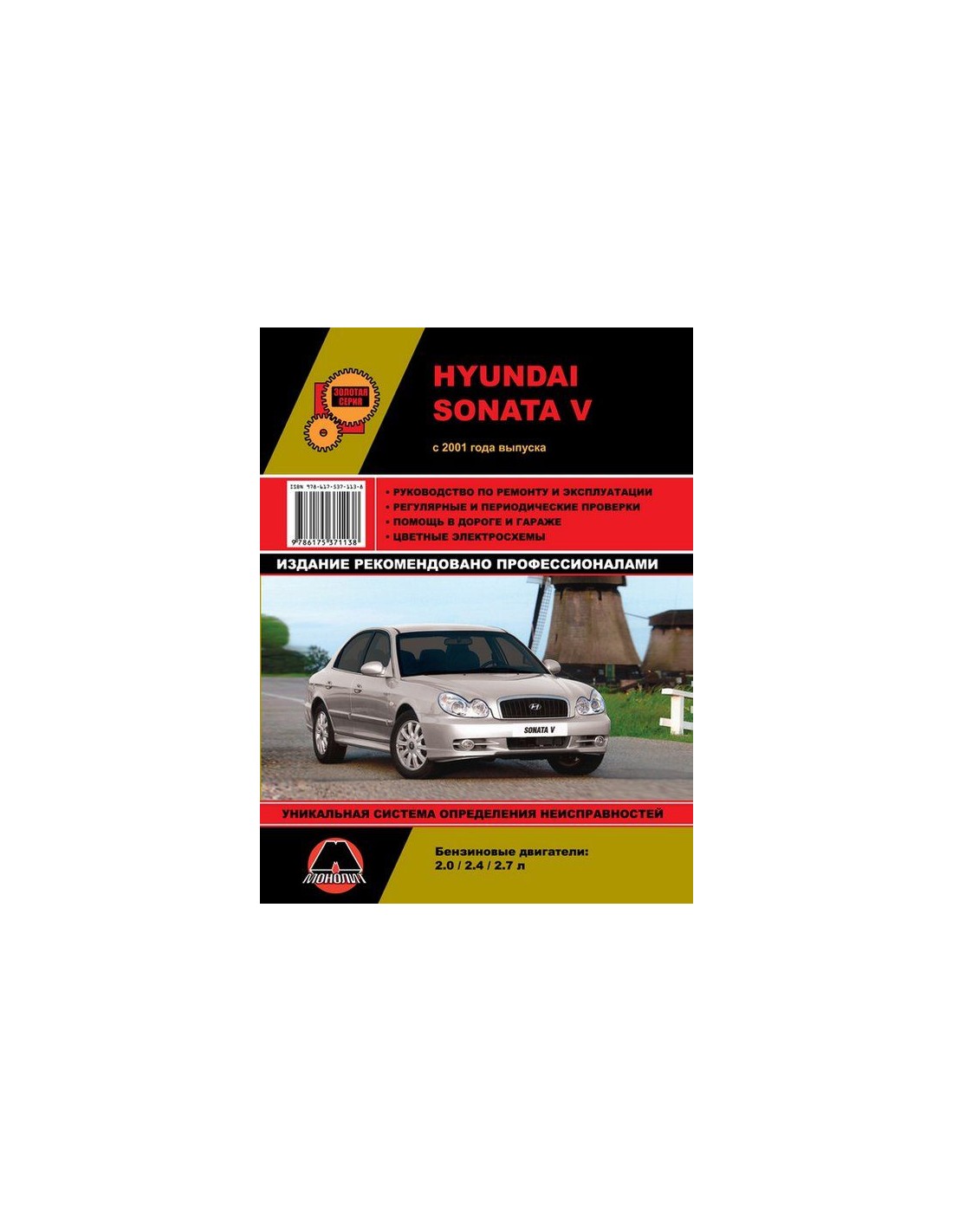 Книга по ремонту Hyundai Sonata V c 2001 г ,содержит руководство по эксплуатации,подробные сведения по техническому обслуживанию автомобиля,диагностике ремонту и регулировке элементов систем двигателя,в том числе электронного управления двигателем,систему смазки и охлаждения,запуска и зарядки,элементов механических и автоматических коробок передач,раздаточной коробки,тормозной системы,включая антиблокировочную систему тормозов,рулевого управления,подвески,кузовных элементов, систем кондиционирования и вентиляции.