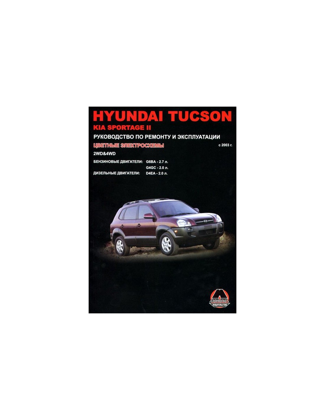 Книга по ремонту Hyundai Tucson с 2003 г ,содержит руководство по эксплуатации,подробные сведения по техническому обслуживанию автомобиля,диагностике ремонту и регулировке элементов систем двигателя,в том числе электронного управления двигателем,систему смазки и охлаждения,запуска и зарядки,элементов механических и автоматических коробок передач,раздаточной коробки,тормозной системы,включая антиблокировочную систему тормозов,рулевого управления,подвески,кузовных элементов, систем кондиционирования и вентиляции.