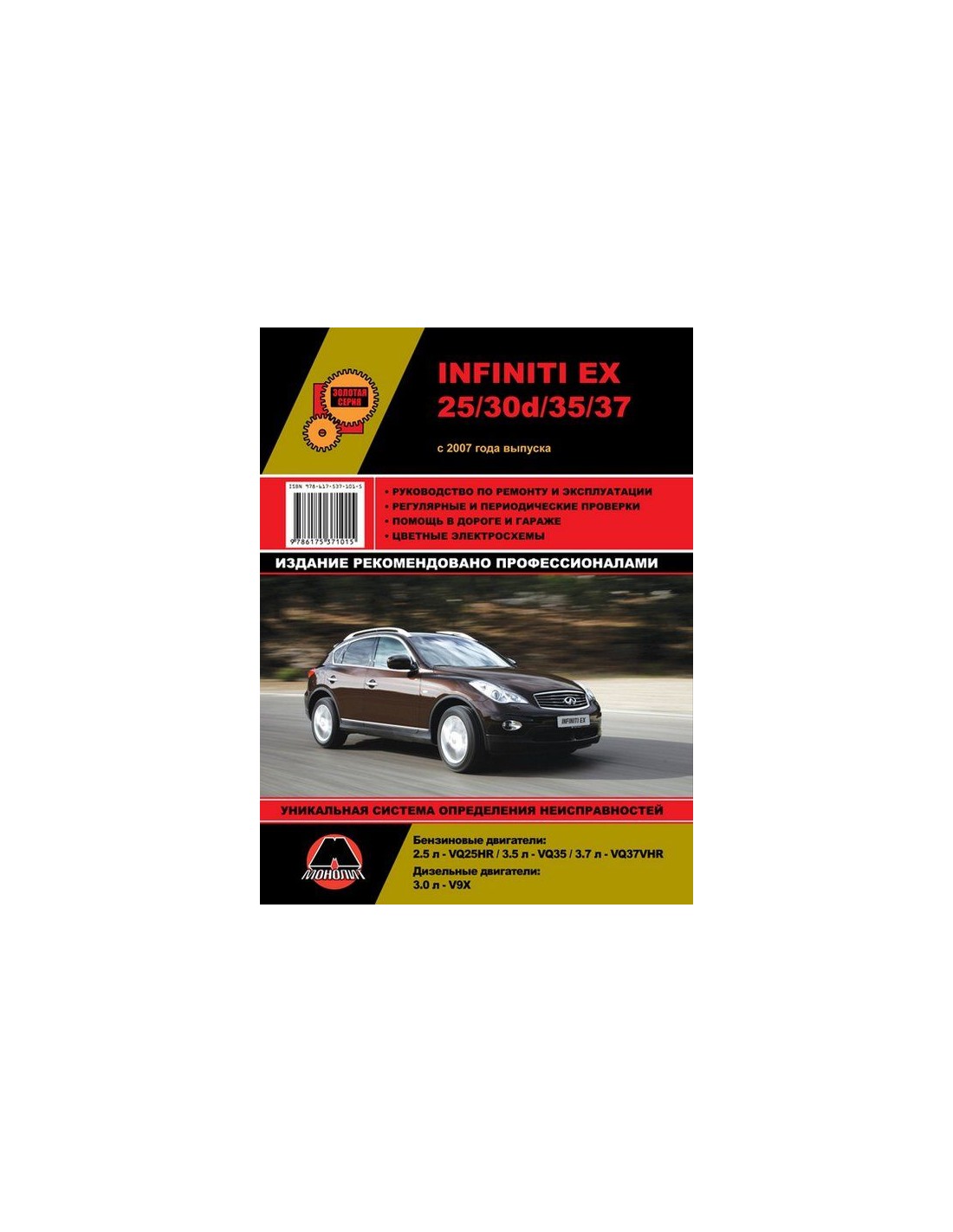 Книга по ремонту Infiniti EX25/EX30d/EX35/EX37 (с 2007) ,содержит руководство по эксплуатации,подробные сведения по техническому обслуживанию автомобиля,диагностике ремонту и регулировке элементов систем двигателя,в том числе электронного управления двигателем,систему смазки и охлаждения,запуска и зарядки,элементов механических и автоматических коробок передач,раздаточной коробки,тормозной системы,включая антиблокировочную систему тормозов,рулевого управления,подвески,кузовных элементов, систем кондиционирования и вентиляции.