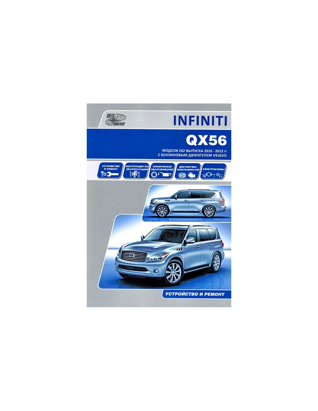 Книга по ремонту INFINITI QX56 ,содержит руководство по эксплуатации,подробные сведения по техническому обслуживанию автомобиля,диагностике ремонту и регулировке элементов систем двигателя,в том числе электронного управления двигателем,систему смазки и охлаждения,запуска и зарядки,элементов механических и автоматических коробок передач,раздаточной коробки,тормозной системы,включая антиблокировочную систему тормозов,рулевого управления,подвески,кузовных элементов, систем кондиционирования и вентиляции.