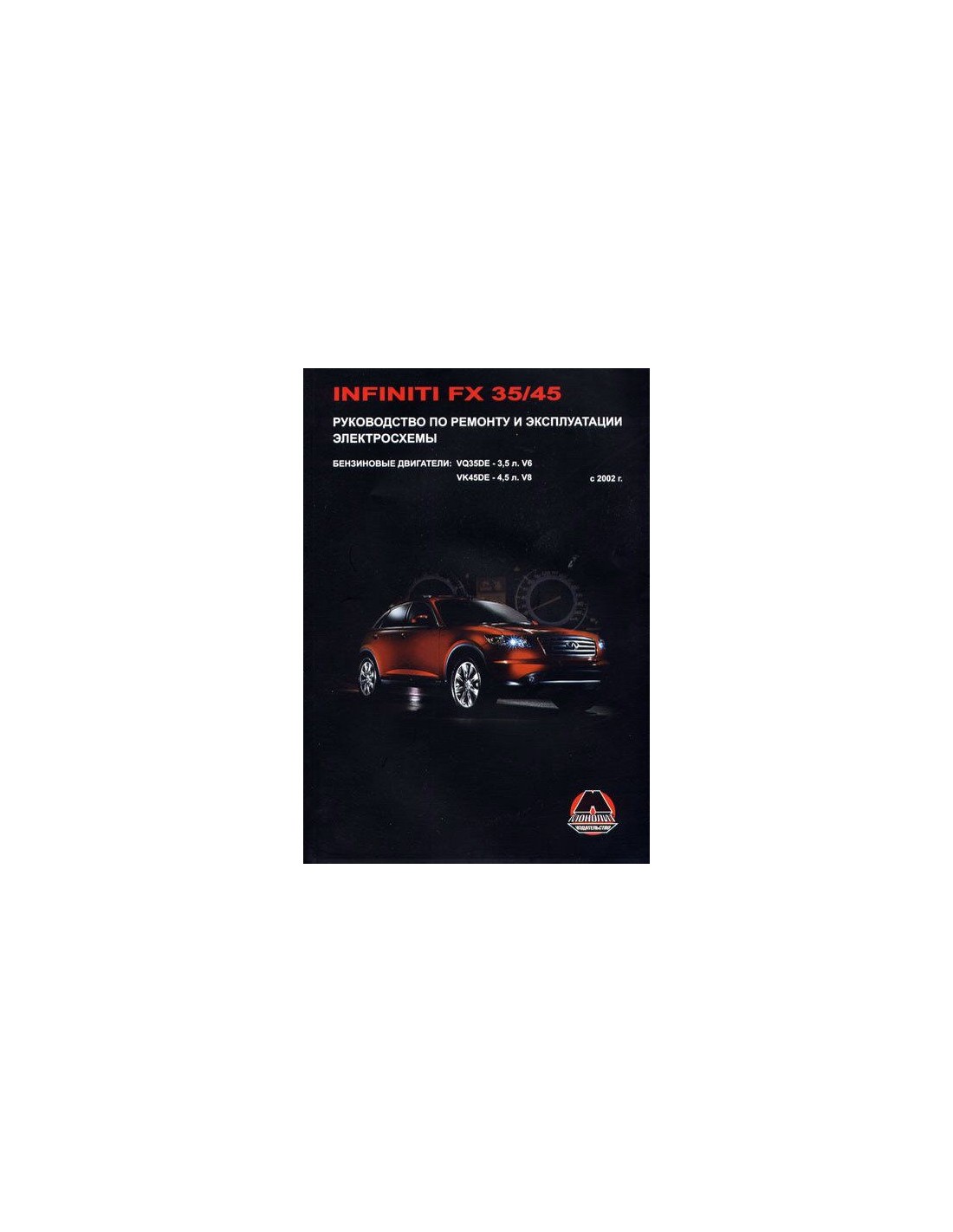 Книга по ремонту Infiniti FX 35/45 ,содержит руководство по эксплуатации,подробные сведения по техническому обслуживанию автомобиля,диагностике ремонту и регулировке элементов систем двигателя,в том числе электронного управления двигателем,систему смазки и охлаждения,запуска и зарядки,элементов механических и автоматических коробок передач,раздаточной коробки,тормозной системы,включая антиблокировочную систему тормозов,рулевого управления,подвески,кузовных элементов, систем кондиционирования и вентиляции.