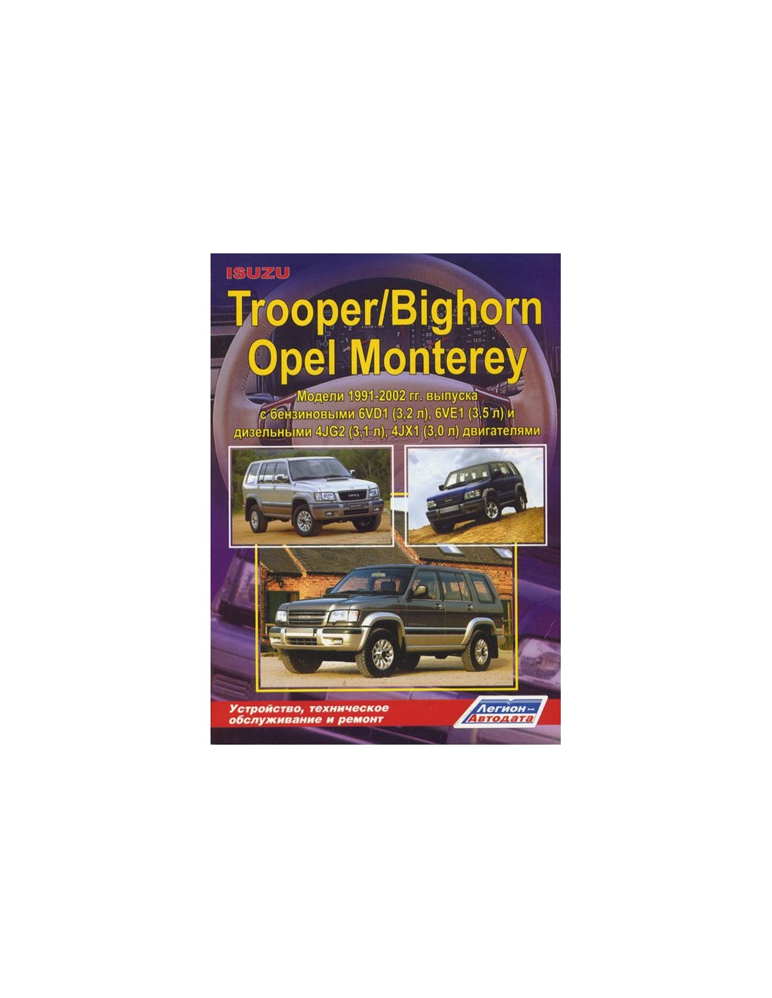 Книга по ремонту Isuzu Trooper/Bighorn & Opel Monterey 1991-02 г.,содержит руководство по эксплуатации,подробные сведения по техническому обслуживанию автомобиля,диагностике ремонту и регулировке элементов систем двигателя,в том числе электронного управления двигателем,систему смазки и охлаждения,запуска и зарядки,элементов механических и автоматических коробок передач,раздаточной коробки,тормозной системы,включая антиблокировочную систему тормозов,рулевого управления,подвески,кузовных элементов, систем кондиционирования и вентиляции.