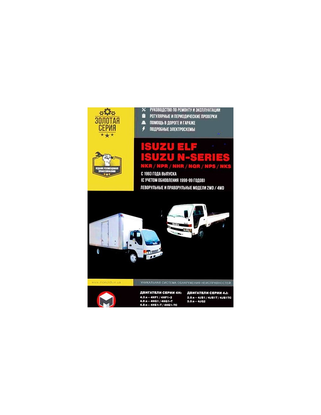 Книга по ремонту Isuzu Elf/NKR/NPR/NHR/NQR/NPS/NKS с 93 г ,содержит руководство по эксплуатации,подробные сведения по техническому обслуживанию автомобиля,диагностике ремонту и регулировке элементов систем двигателя,в том числе электронного управления двигателем,систему смазки и охлаждения,запуска и зарядки,элементов механических и автоматических коробок передач,раздаточной коробки,тормозной системы,включая антиблокировочную систему тормозов,рулевого управления,подвески,кузовных элементов, систем кондиционирования и вентиляции.