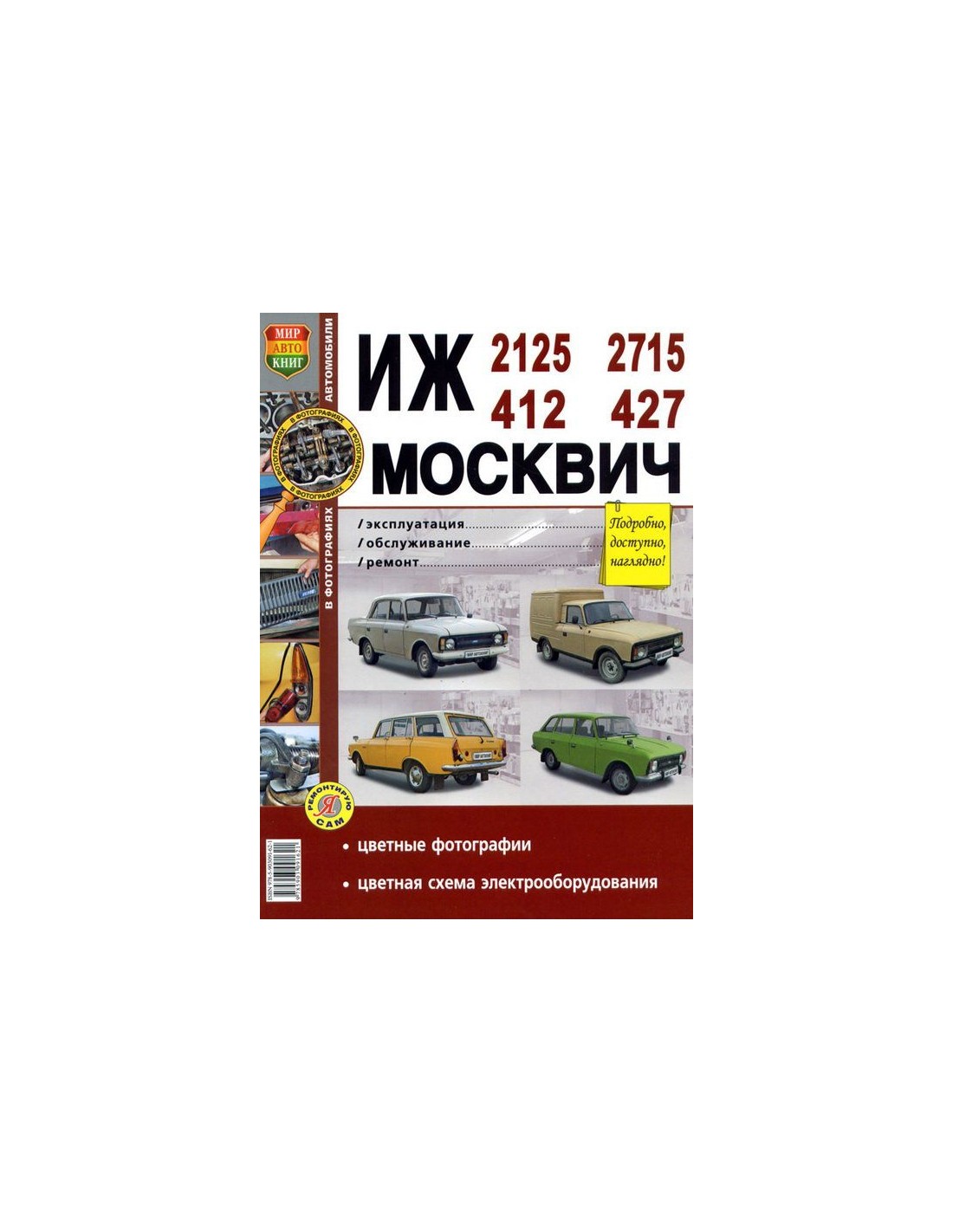 Книга по ремонту Иж, Москвич- 2125, 2715,412,427 ,содержит руководство по эксплуатации,общие сведения об устройстве автомобиля,рекомендации по техническому обслуживанию автомобиля,диагностике ремонту и регулировке элементов систем двигателя,систему смазки и охлаждения,запуска и зарядки,элементов механических и автоматических коробок передач,тормозной системы,включая антиблокировочную систему тормозов,рулевого управления,подвески,кузовных элементов, систем кондиционирования и вентиляции.
