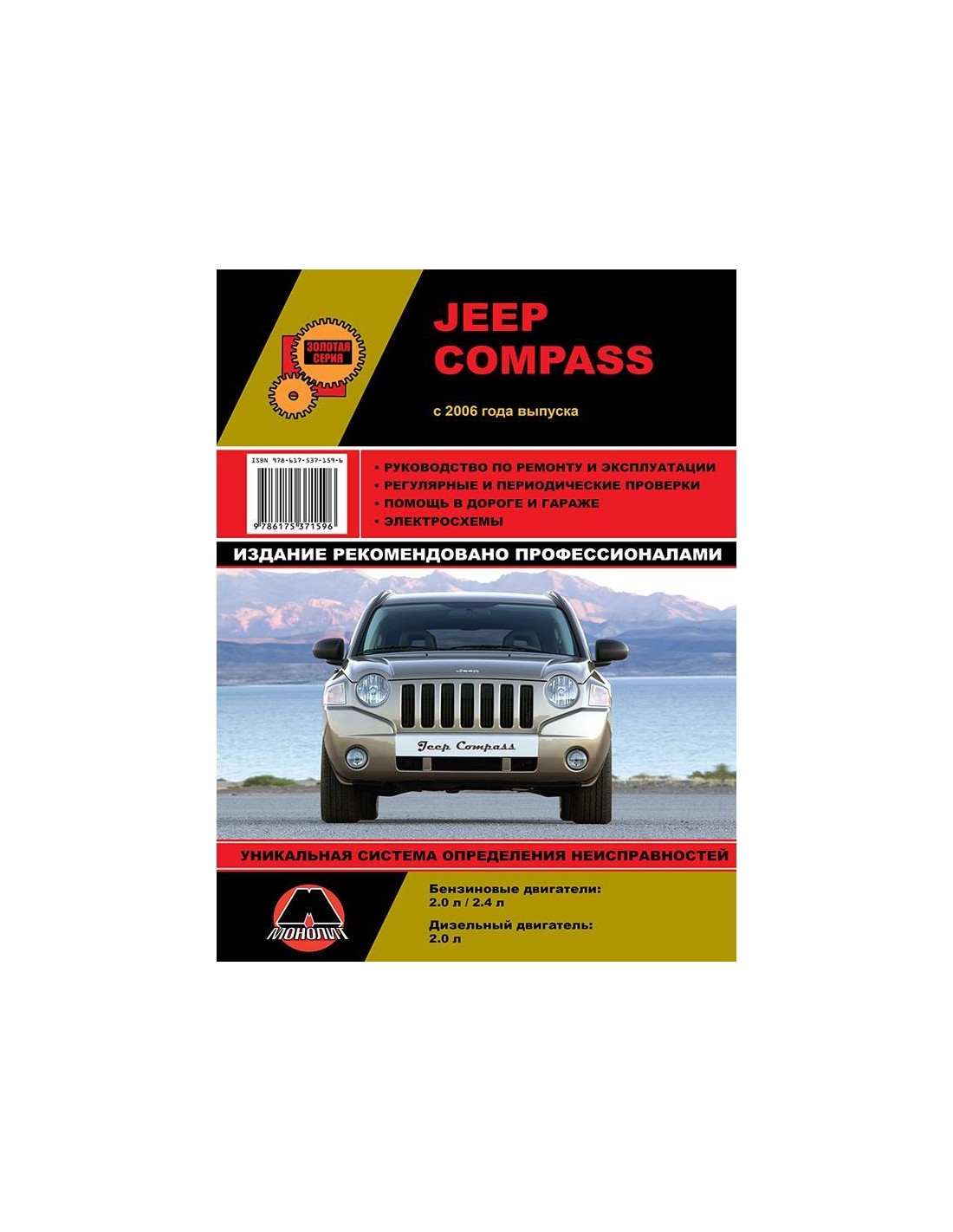 Книга по ремонту Jeep Compass с 2006 ,содержит руководство по эксплуатации,подробные сведения по техническому обслуживанию автомобиля,диагностике ремонту и регулировке элементов систем двигателя,в том числе электронного управления двигателем,систему смазки и охлаждения,запуска и зарядки,элементов механических и автоматических коробок передач,раздаточной коробки,тормозной системы,включая антиблокировочную систему тормозов,рулевого управления,подвески,кузовных элементов, систем кондиционирования и вентиляции.