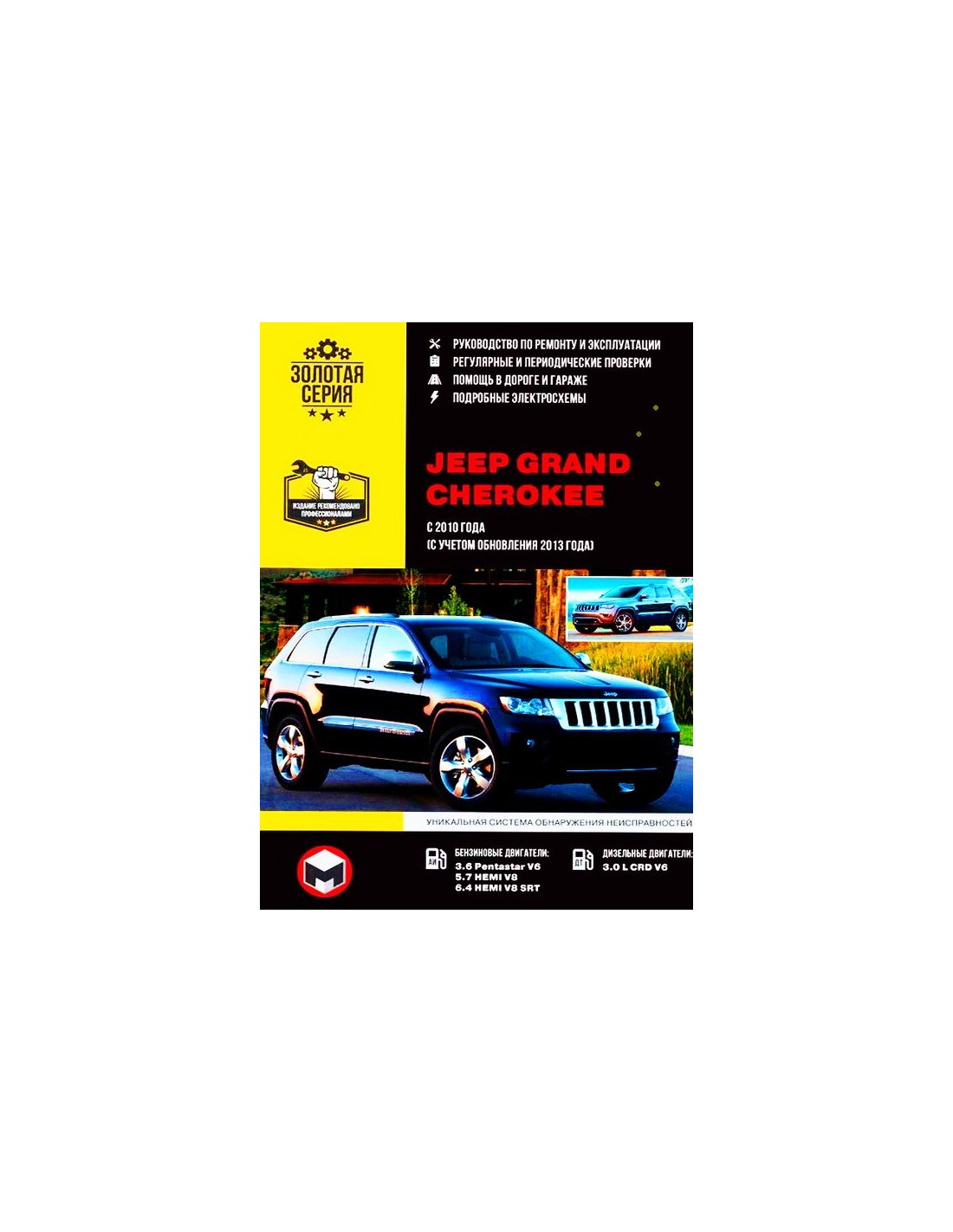 Книга по ремонту Jeep Grand Cherokee с 2010/2013 ,содержит руководство по эксплуатации,подробные сведения по техническому обслуживанию автомобиля,диагностике ремонту и регулировке элементов систем двигателя,в том числе электронного управления двигателем,систему смазки и охлаждения,запуска и зарядки,элементов механических и автоматических коробок передач,раздаточной коробки,тормозной системы,включая антиблокировочную систему тормозов,рулевого управления,подвески,кузовных элементов, систем кондиционирования и вентиляции.