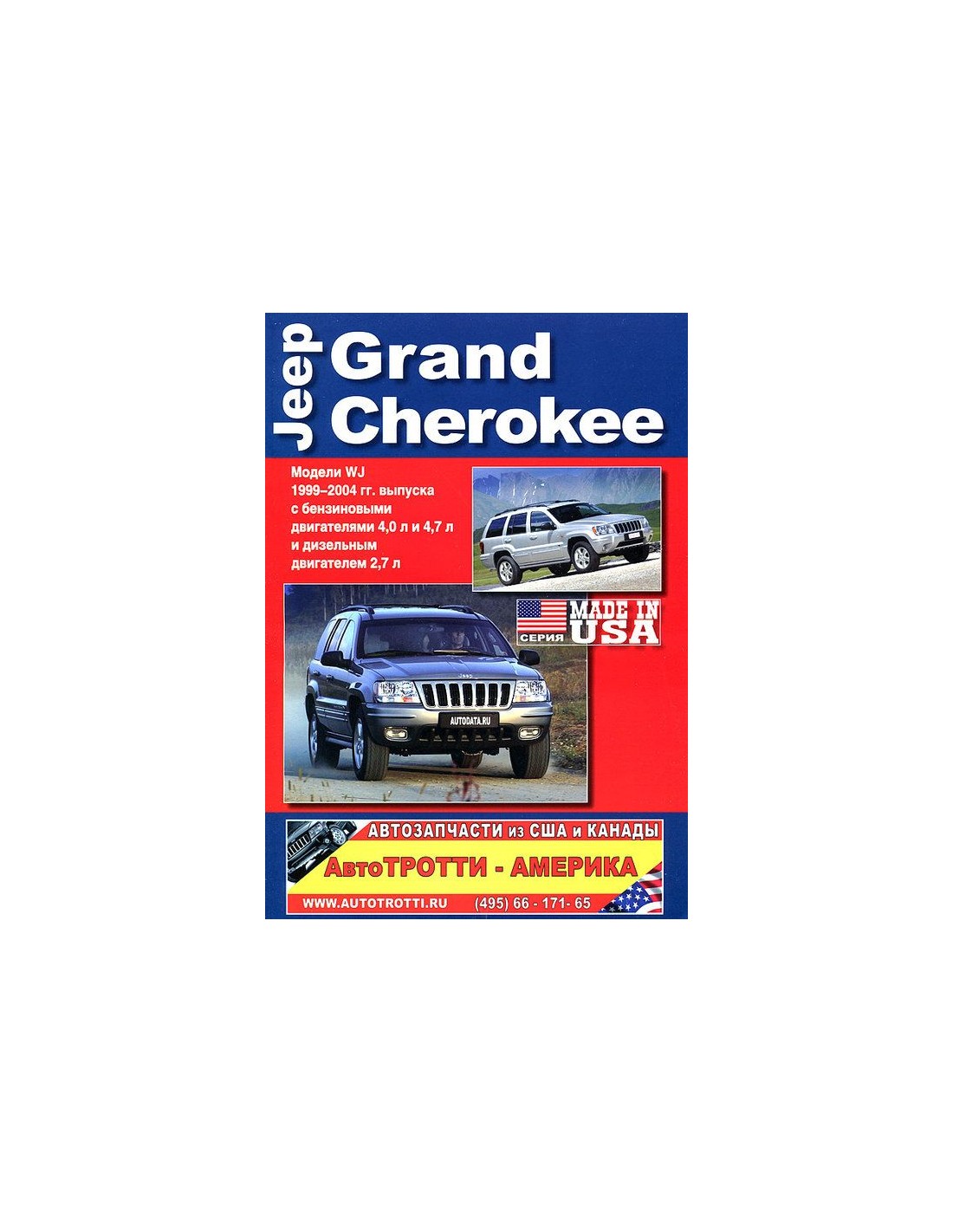 Книга по ремонту Jeep Grand Cherokee WJ 1999 - 2004 г ,содержит руководство по эксплуатации,подробные сведения по техническому обслуживанию автомобиля,диагностике ремонту и регулировке элементов систем двигателя,в том числе электронного управления двигателем,систему смазки и охлаждения,запуска и зарядки,элементов механических и автоматических коробок передач,раздаточной коробки,тормозной системы,включая антиблокировочную систему тормозов,рулевого управления,подвески,кузовных элементов, систем кондиционирования и вентиляции.