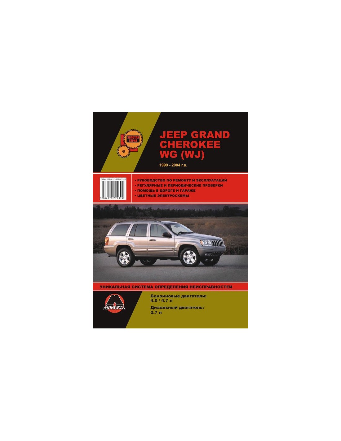 Книга по ремонту Jeep Grand Cherokee модели WG (WJ) с 1999-2004 г ,содержит руководство по эксплуатации,подробные сведения по техническому обслуживанию автомобиля,диагностике ремонту и регулировке элементов систем двигателя,в том числе электронного управления двигателем,систему смазки и охлаждения,запуска и зарядки,элементов механических и автоматических коробок передач,раздаточной коробки,тормозной системы,включая антиблокировочную систему тормозов,рулевого управления,подвески,кузовных элементов, систем кондиционирования и вентиляции.