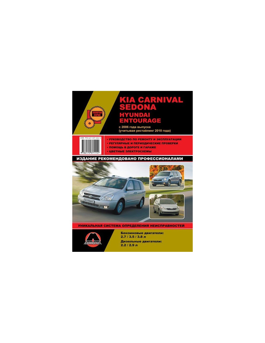 Устройство автомобиля,возможные неисправности и методы их устранения, сопрягаемые размеры основных деталей и пределы их допустимого износа,рекомендуемое смазочные материалы,рабочие жидкости и каталожные номера расходных запчастей,необходимых для технического обслуживания,размеры рекомендуемых и допускаемых шин и дисков-все это можно найти на страницах издания "Монолит" Книга автомобильная на Kia Carnival / Sedona с 2006 г