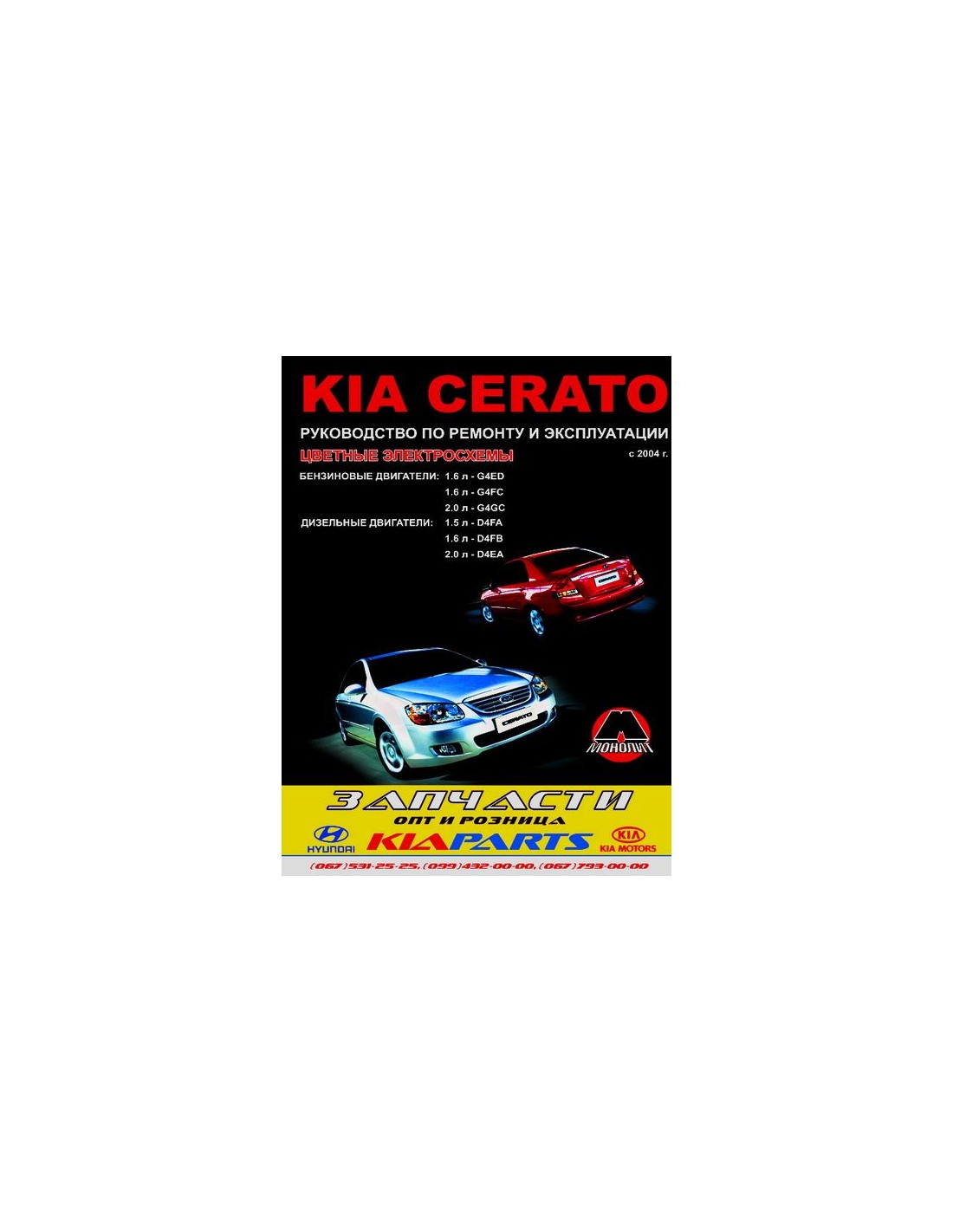 Устройство автомобиля,возможные неисправности и методы их устранения, сопрягаемые размеры основных деталей и пределы их допустимого износа,рекомендуемое смазочные материалы,рабочие жидкости и каталожные номера расходных запчастей,необходимых для технического обслуживания,размеры рекомендуемых и допускаемых шин и дисков-все это можно найти на страницах издания "Монолит" Книга автомобильная на KIA Cerato c 2004г