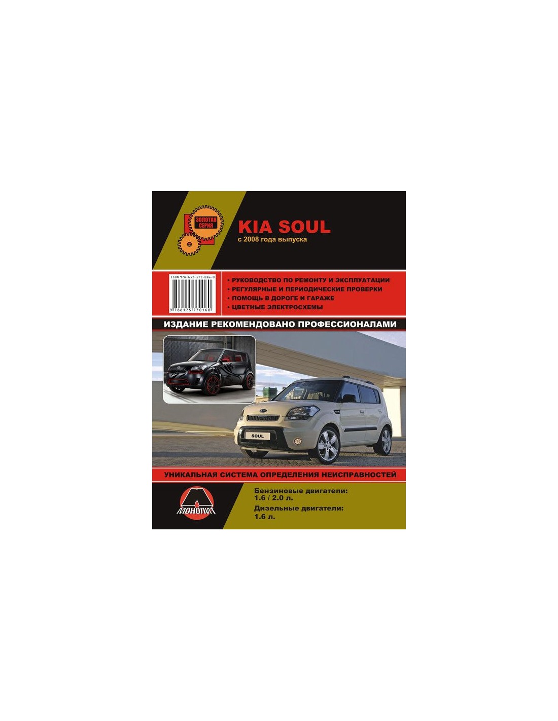 Книга по ремонту Kia Soul c 2008г ,содержит руководство по эксплуатации,подробные сведения по техническому обслуживанию автомобиля,диагностике ремонту и регулировке элементов систем двигателя,в том числе электронного управления двигателем,систему смазки и охлаждения,запуска и зарядки,элементов механических и автоматических коробок передач,раздаточной коробки,тормозной системы,включая антиблокировочную систему тормозов,рулевого управления,подвески,кузовных элементов, систем кондиционирования и вентиляции.