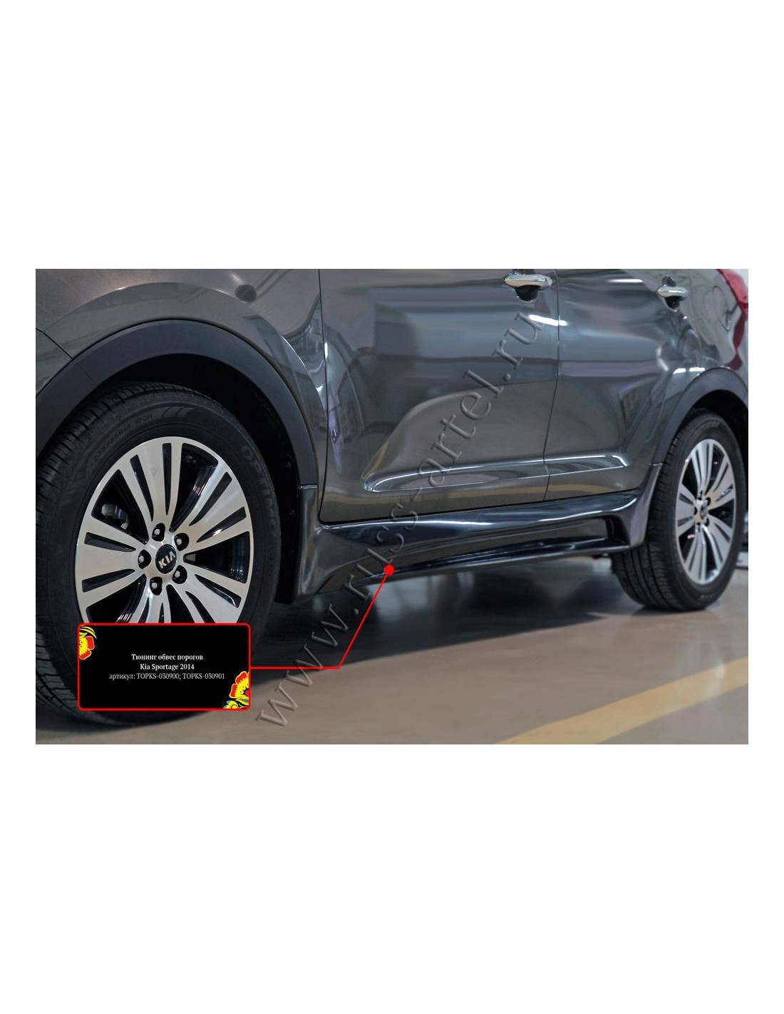 Тюнинг обвес порогов улучшает внешний вид автомобиля. Обвес изготовлен из качественного AБС-пластика. Крепится с помощь штатных элементов крепления и полиуретанового герметика. Тюнинг обвес скрывает появившиеся сколы и прочие дефекты кузова. Подходит на автомобиль Kia Sportage 2014